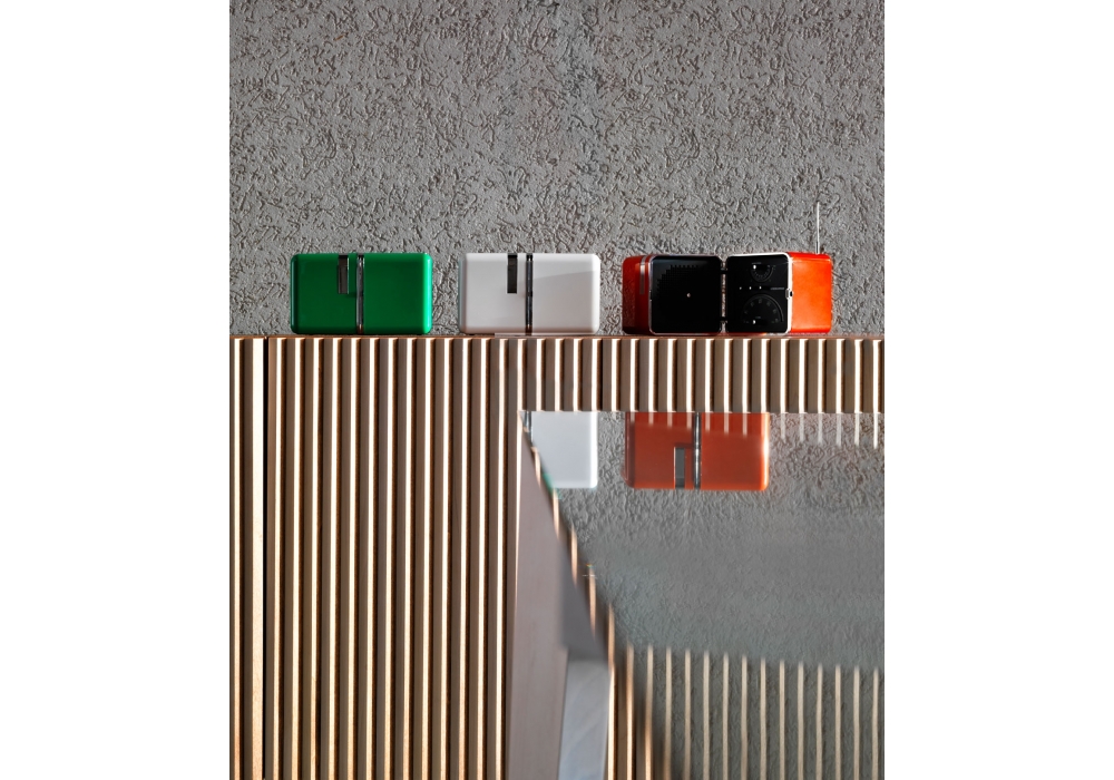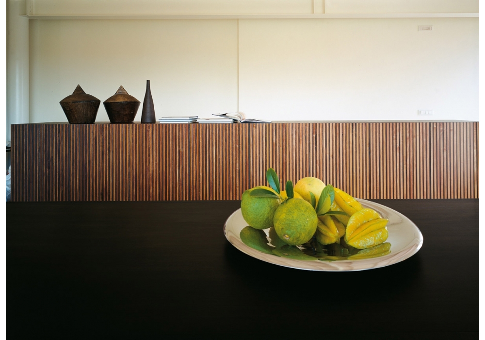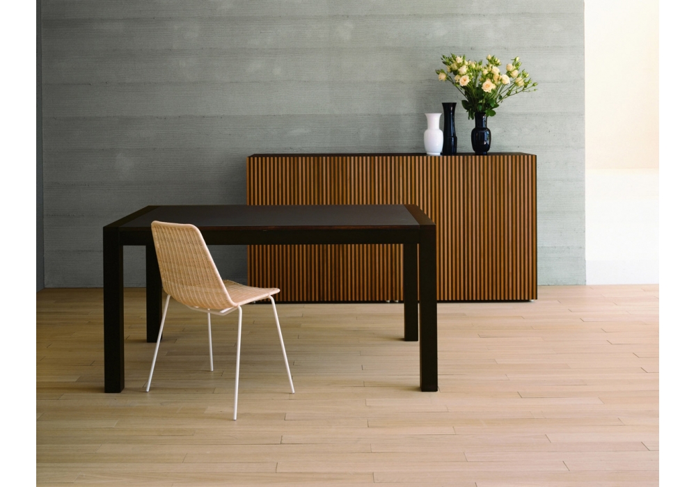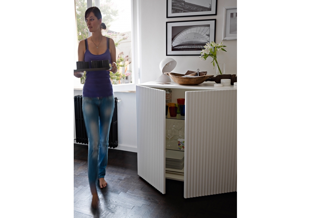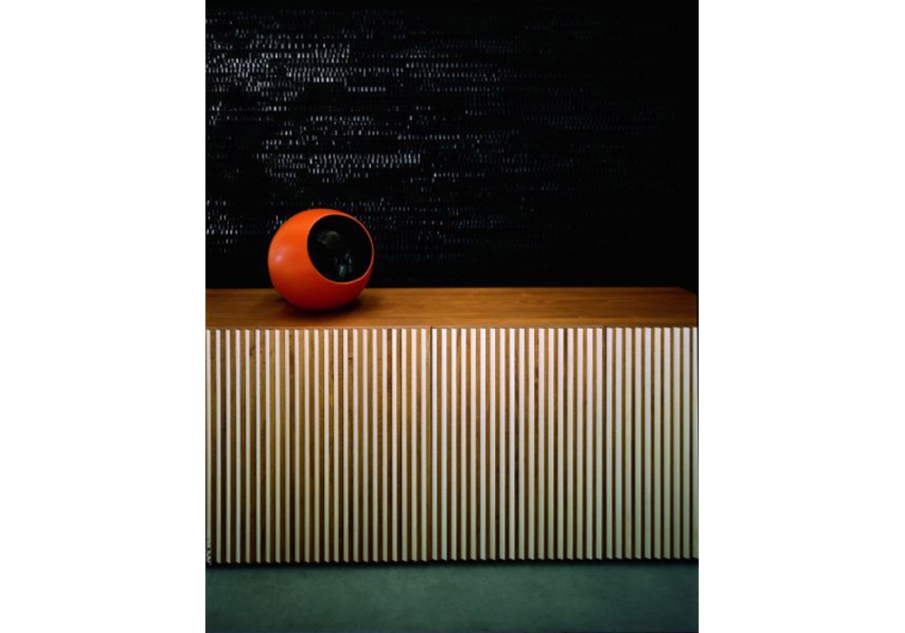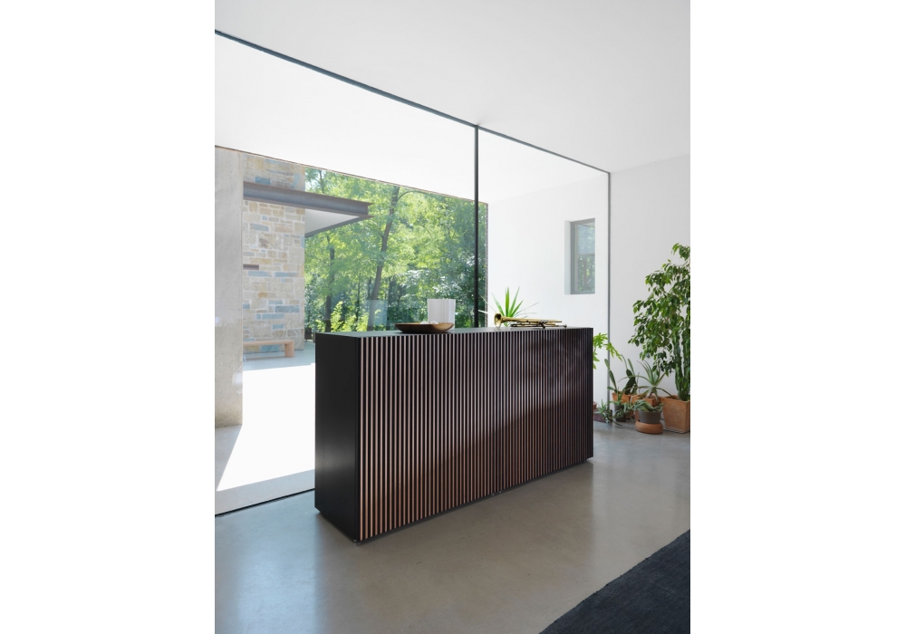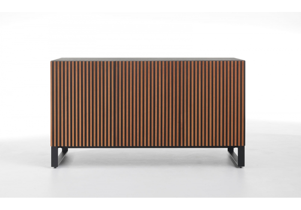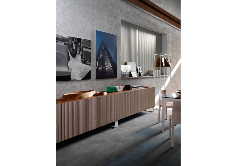 Leon Decor von Casamania & Horm ist ein Sideboard mit einer Struktur aus lackierten Spanplatten. MDF-Türen. An den Türen sind Dekorationen aus Canaletto-Nussbaum oder Natureiche angebracht. Innenregale aus gehärtetem Glas.