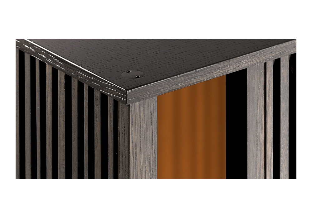 Lloyd designed by Jean-Marie Massaud for Poltrona Frau is a sideboard with variable geometries. A series of thin vertical wooden rods form light grids that run from top to bottom on invisible horizontal guides. Each grid can be moved as desired creating diff erent sequences each time. A fluctuating score of solids and voids, of light and shade.