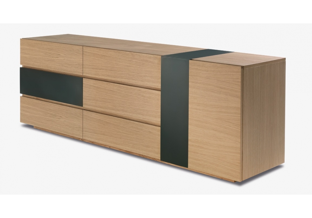 Wabi von Setsu & Shinobu Ito für Riva 1920 entworfen, ist ein Sideboard mit 2 Türen, 2 beweglichen Regalen und 3 Schubladen. Aus Massivholz und Tischlerplatte, gekennzeichnet durch Eiseneinsätze und gefräste Griffe für Türen und Schubladen, hergestellt mit traditioneller Schwalbenschwanzverbindung.