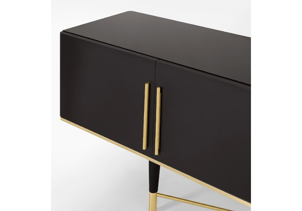 Tama Crédence von Carlo Colombo für Gallotti&Radice entworfen, ist ein Sideboard aus Eschenholz schwarz offenporig gebeizt mit Metallteile Messing satiniert lackiert. Top aus Glas 6mm vorgespannt und Innenrückwand aus Glas 6mm beide schwarzbraun hochglanz lackiert. Rautenförmige Gravierung auf Innenglasrückwand. Lieferbar mit Boden aus vorgespannt Rauchglas “grigio Italia” 8mm und Objektträger aus Holz. Mit Innenbeleuchtung LED aktiviert durch einen Sensor bei der Öffnung der Türen.