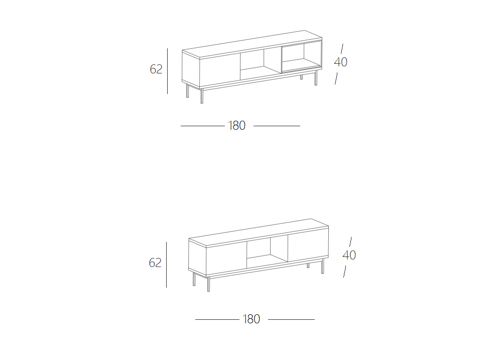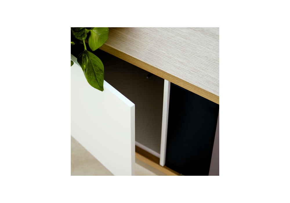 Slats von Marc Krusin für Punt entworfen, ist ein Sideboard mit eichenfurnierter MDF-Struktur, Türen mit 95°-Öffnung, lackierten Fächern und schwarz pulverbeschichtetem Stahlsockel mit verstellbaren Füßen. Verfügbar in verschiedenen Ausführungen und Ausführungen.