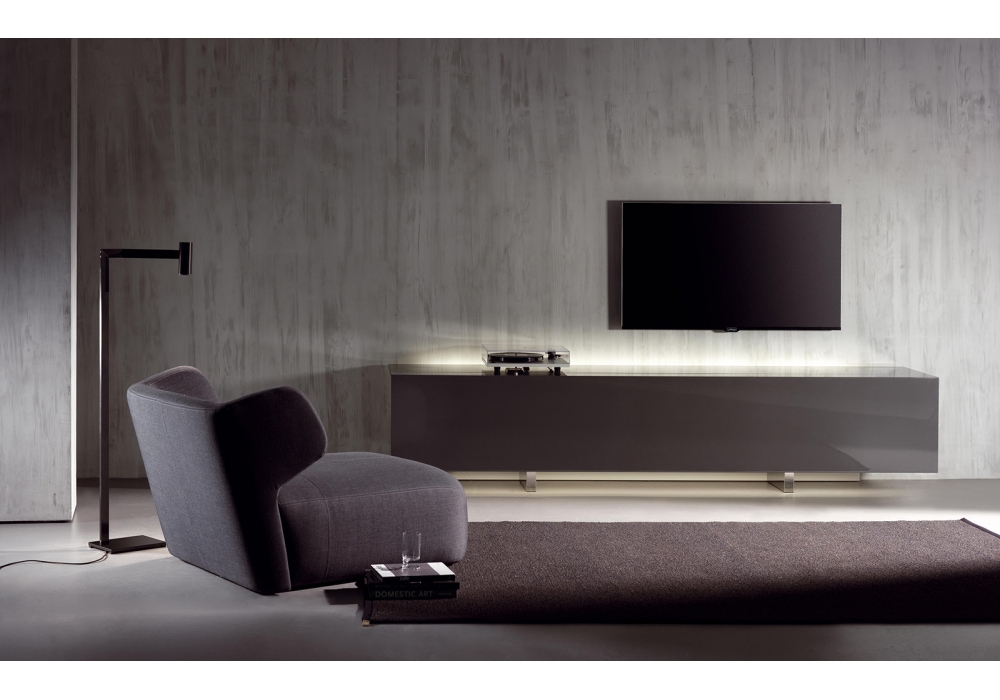 Ludwig, entworfen von Lodovico Acerbis für Acerbis, ist ein Sideboard, das in Holz oder lackiertem Oberteil und Tür erhältlich ist. Sideboard mit dem innovativen Dual-Flap®-Simultanöffnungssystem für die Tür und einen Teil der Oberseite. Innenrahmen aus glänzend verchromtem Metall. Das Sideboard enthält eine LED mit einem einzigen Schalter und einem Netzkabel. Erhältlich in zwei Dimensionen und zwei Schubladen als Zubehör.