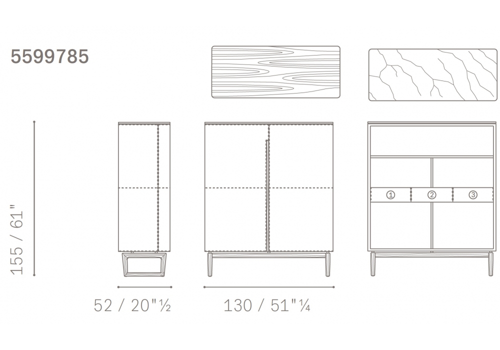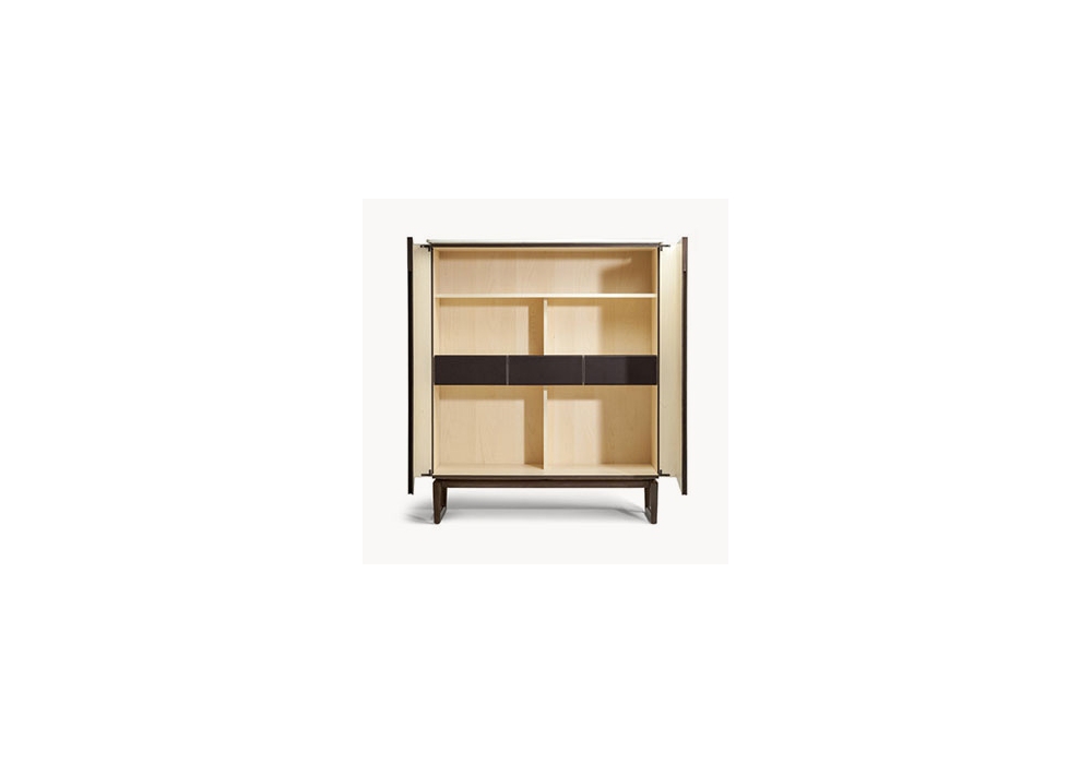 Fidelio von Roberto Lazzeroni für Poltrona Frau entworfen, ist ein hoher Schrank mit Tragestruktur aus massiver Esche und Multischicht-Birkenholz. Die Tischplatte ist aus Eschenholz mit Mokka-Finish oder aus Emperador-Marmor mit poliertem Finish oder Marmor Calacatta Gold mit glänzendem oder Mattglanz-Finish gefertigt. Die Stahlfüße mit Gummikappen sind einstellbar.