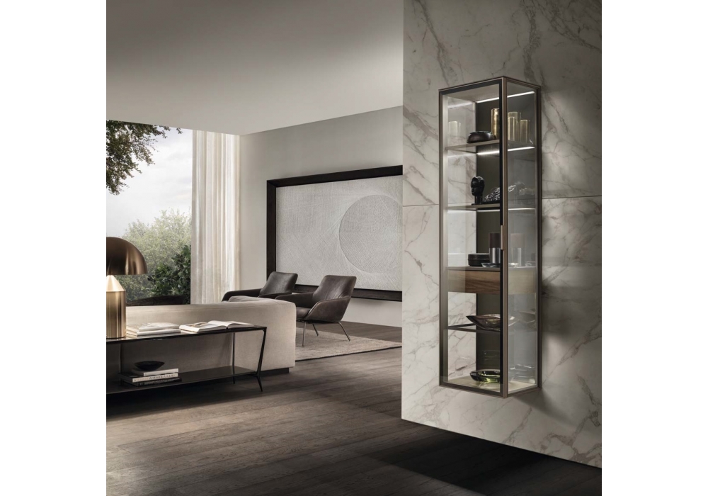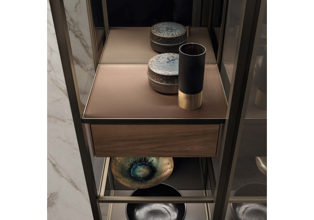 Alambra von Giuseppe Bavuso für Rimadesio entworfen, ist ein schöner Hängeschrank mit Bronzo Struktur, Tür und Seitenteile In klarem reflektierendem Glas, grauer Spiegelrückseite Platte und Regale in grauem, transparentem Glas. Walnuss furnierte Innenschublade mit Oberseite Und Futter aus Castoro-regeneriertem Leder. Optionale interne LED-Beleuchtung.