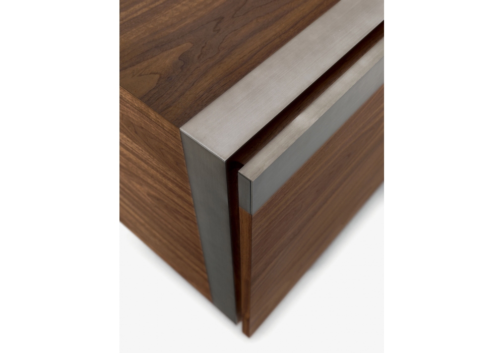 Linear von David Knott von Riva 1920 entworfen, ist ein Sideboard mit Aussenstruktur und Türen aus Holz. Zwei seitliche Türen mit klarglas Einlegeboden. Zwei mittige Türen mit 2 ausziehbaren Einlegeböden. Griffmulde. Led Beleuchtung in allen Modulen. Metallblende und Griffe aus lackiert Natureisen.