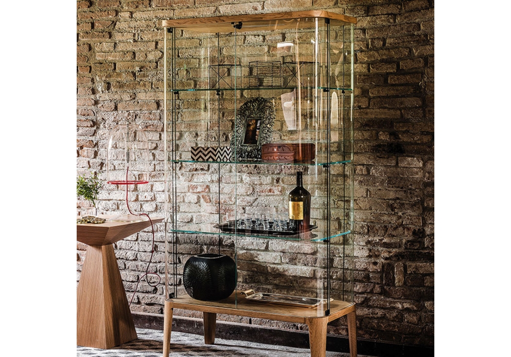 Chantal, von Angelo Tomaiuolo für Cattelan Italia entworfen, ist eine Vitrine mit Regalen aus transparentem, extra klarem Glas. Boden und Decke in Nussbaum Canaletto oder verbrannte Eiche. Mit LED-Licht. Verfügbar in 2 Abmessungen. Belastbarkeit: jeder Glasboden kg 6.