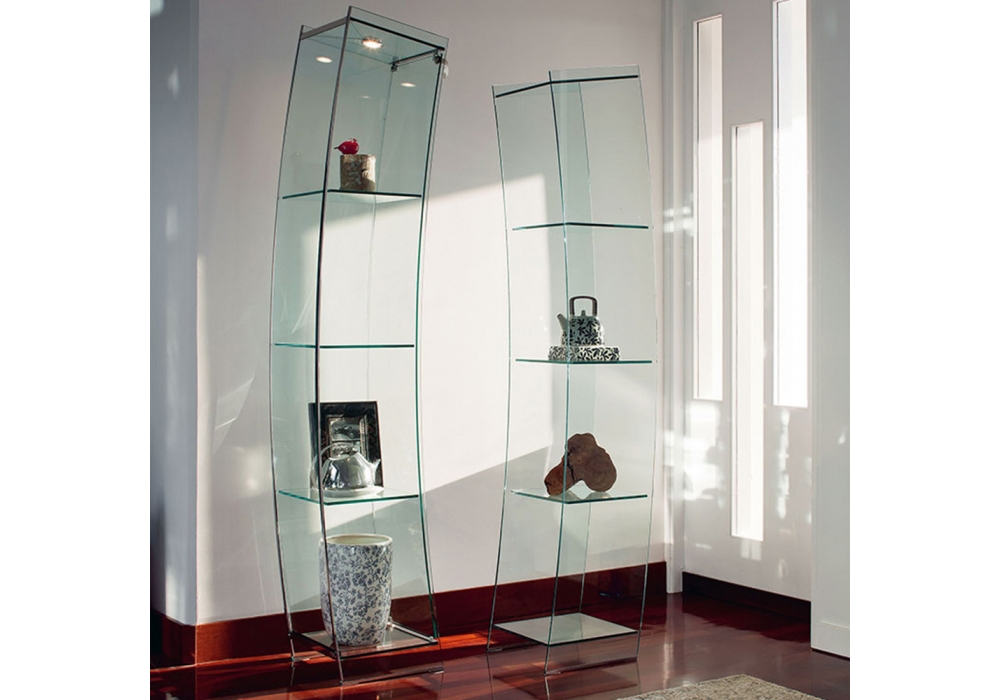 Open Wind, von studio 28 für Cattelan Italia entworfen, ist eine Offene Vitrine aus klarem und gebogenem Glas Stahldetails. Belastbarkeit: jeder Glasboden kg 7. Verfügbar in zwei Abmessungen.