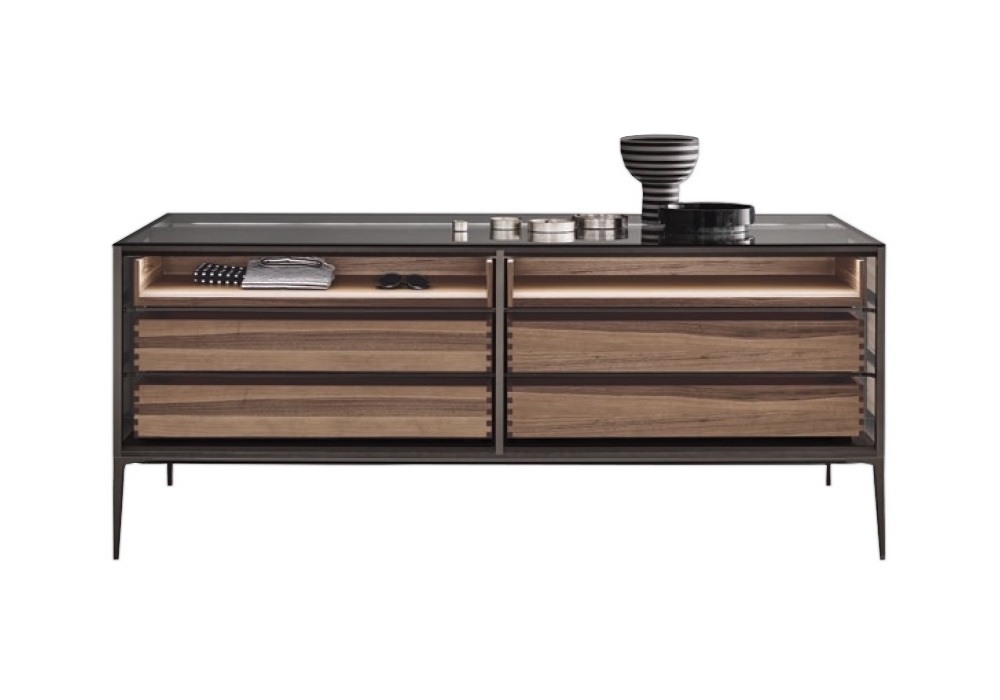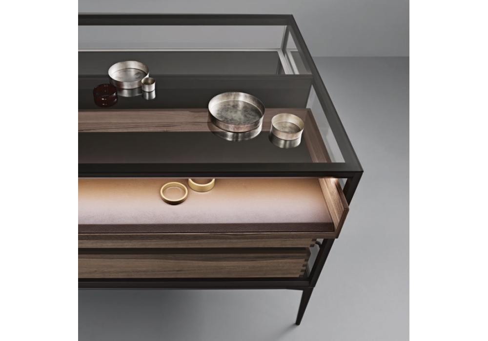 Alambra von Giuseppe Bavuso für Rimadesio entworfen, ist ein Sideboard-Vitrine mit Aluminium-Struktur und Platte, Türen und Seitenteile aus Glas, verfügbar in verschiedenen Ausführungen. Regalen aus grauen transparenten Glas, Rückenlehne aus grauen Spiegel und Schubladen aus Nussbaum mit Futter im Castoro-regenerierten Leder. Optionale interne Led-Beleuchtung.