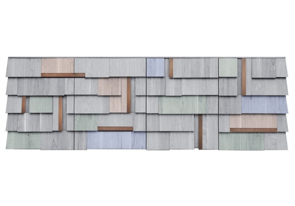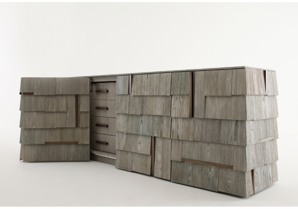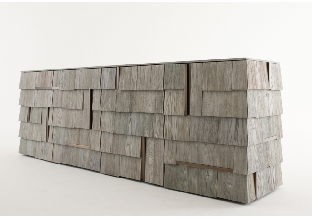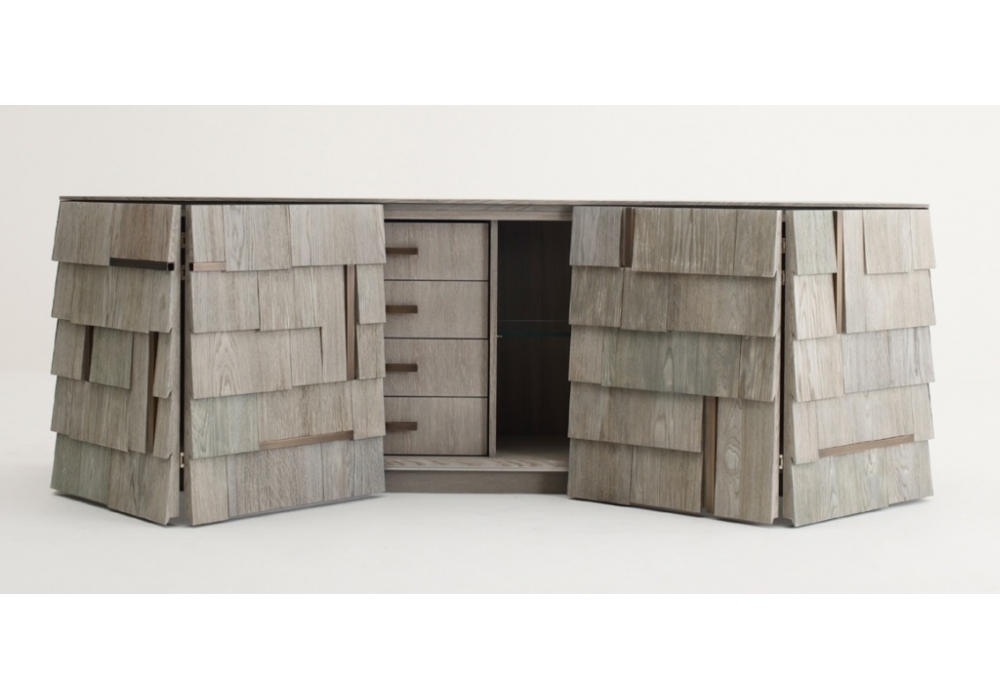 Tiles von Ferruccio Laviani für Emmemobili entworfen, ist ein Sideboard charakterisiert für die Überdeckung auf den 3 Seiten mit profilierten Elementen, in Form eines Dachziegels, aus Eiche Kernholz. Griffe und dekorative Einlagen aus gebräuntem Messing. Innere Kommode nach Bedarf. Auch verfügbar in 3 Abmessungen.