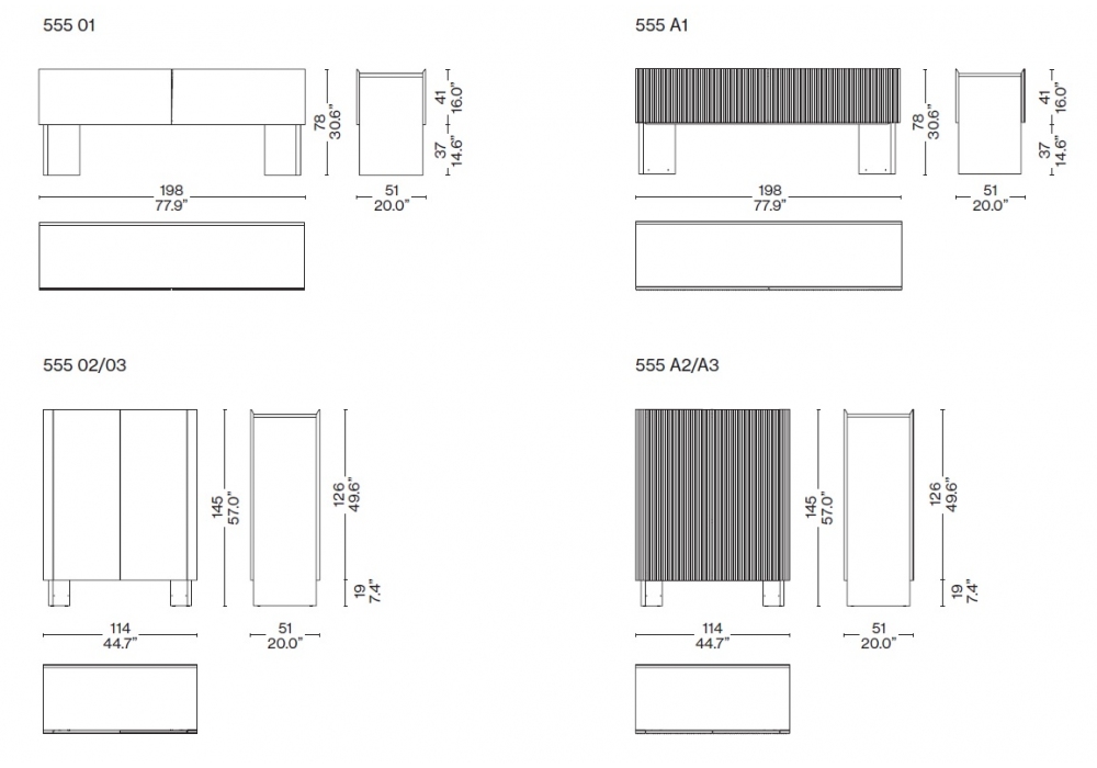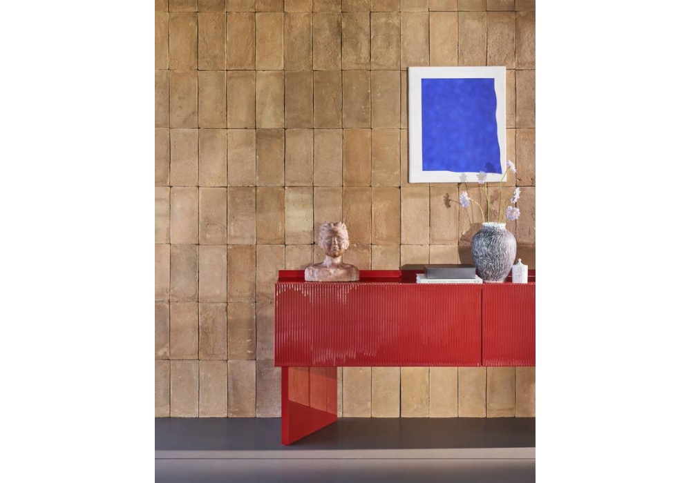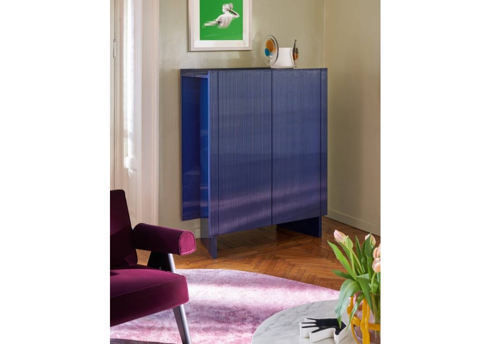 555 Hayama von Patricia Urquiola für Cassina entworfen, ist ein Sideboard mit einem glänzend lackierten MDF-Rahmen. Verfügbar mit glatten oder Canneté-Effekt-Türen.