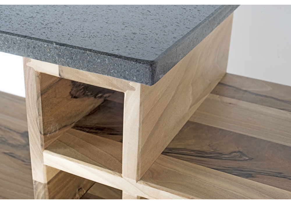 Zabib von Salva Longo für Ornythos entworfen ist ein Nussbaum Minibar, während die obere und die Beine in Lavagestein sind.