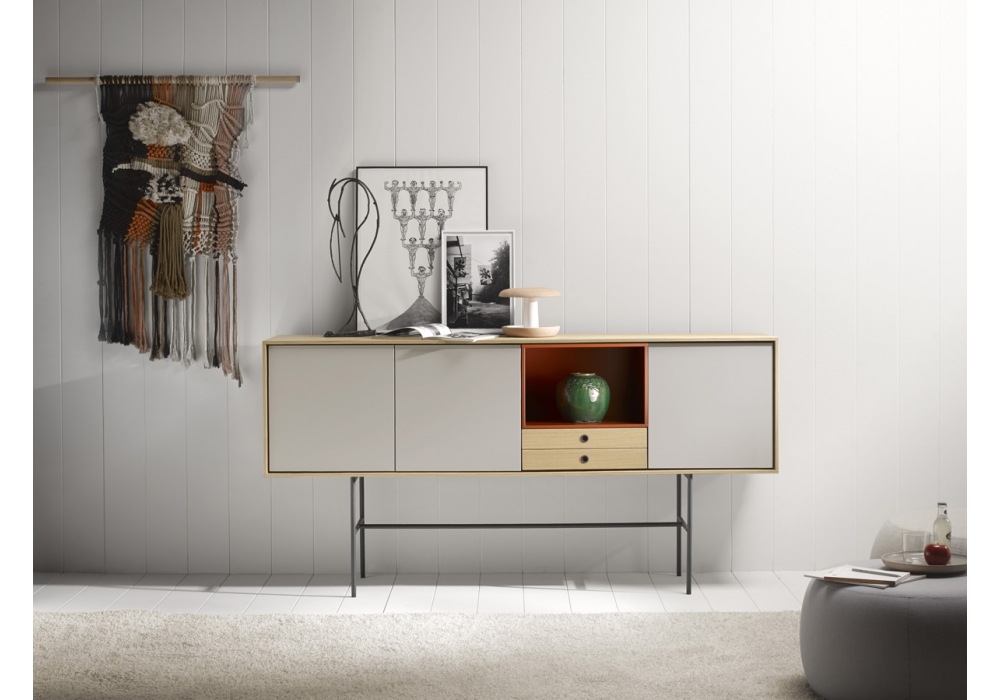 Aura von Angel Martí und Enrique Delamo für Treku entworfen, ist ein Sideboard aus der Aura-Kollektion. Die Komposition hat eine Holzstruktur auf Metallbeinen, zwei Schubladen in Holzoptik, ein offenes Fach und drei Türen in Lackoptik.