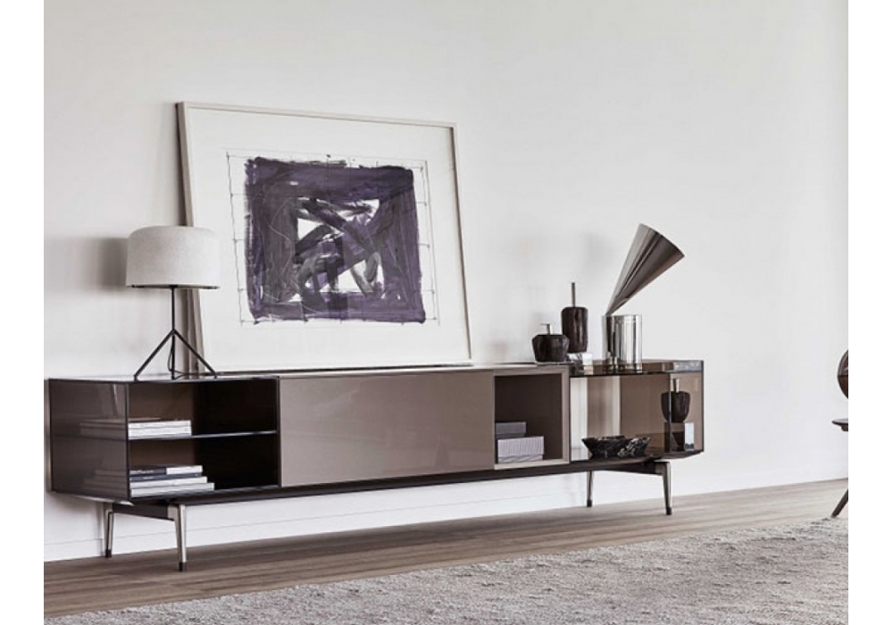 Jeremy von Carlo Colombo entworfen, ist ein Sideboard mit Eichenstruktur, Glasböden, pulverbeschichtetem Metallfuß und Füßen aus Aluminiumdruckguss. Verfügbar in verschiedenen Ausführungen und Modellen.