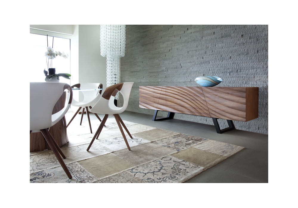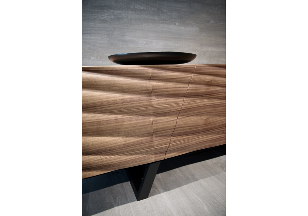 Move Wood von Mac Stopa für Tonon entworfen, ist ein Sideboard mit einer Struktur aus furniertem Holz (Eiche, Canaletto-Walnuss und lackiert) und einer Vorderseite aus dreidimensionalem MDF, das aus Eiche oder Canaletto-Walnuss furniert ist. Beine aus schwarz oder weiß lackierter massiver Buche.
