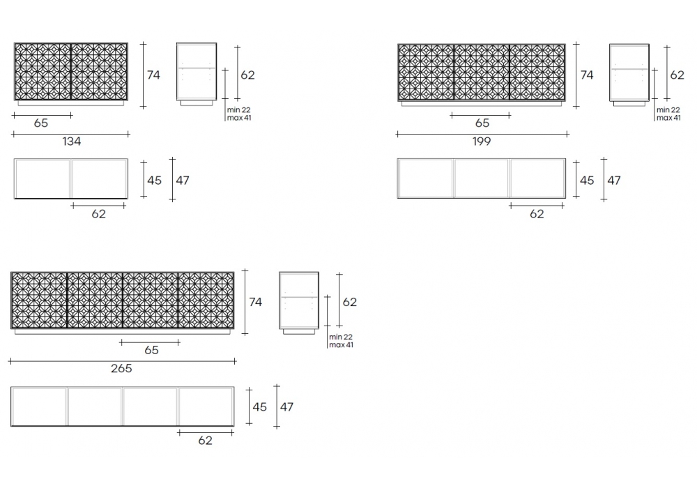 | Abmessungen | 134 x 47 x H 74 cm; 199 x 47 x H 74 cm; 265 x 47 x H 74 cm. |