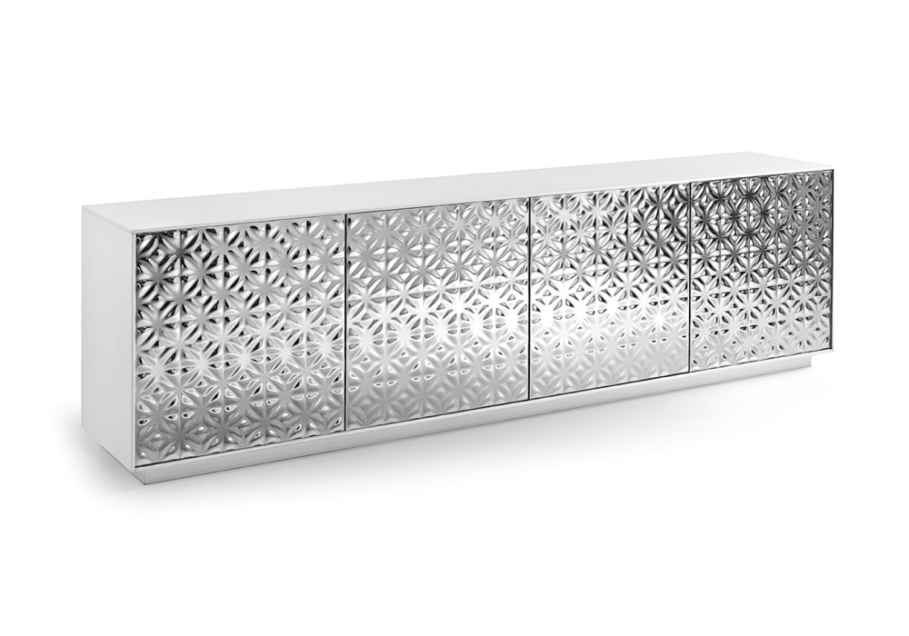 Echo von Marcel Wanders Studio für Fiam entworfen, ist ein Sideboard mit Struktur aus lackiertem Holz in Weiß, Vulkangrau oder Metallic-Greige. Die Türen bestehen aus geschmolzenem oder glattem gehärtetem Glas und sind in verschiedenen Ausführungen erhältlich. Innenregale aus gehärtetem Rauchglas.