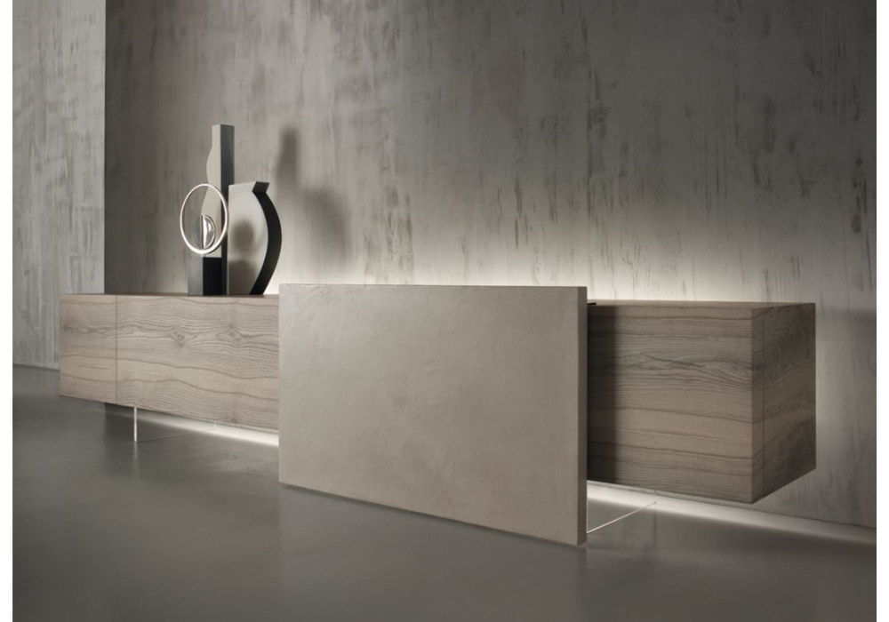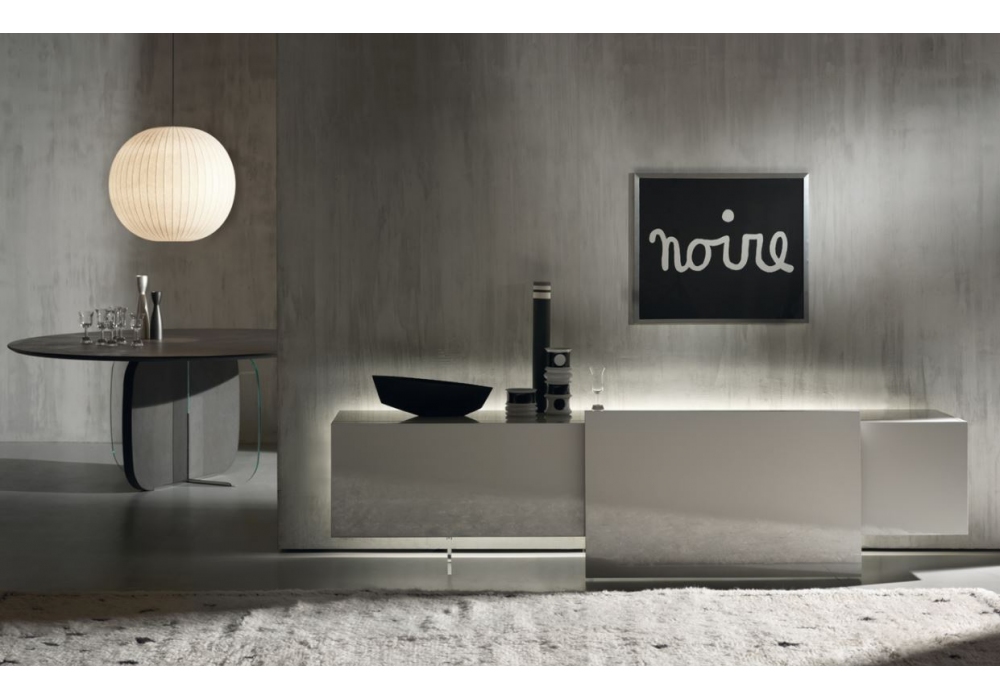 Alterego Low, entworfen von Giacomo Moor für Acerbis, ist ein niedriges Sideboard aus Methacrylat, Struktur und Flügeltür aus Holz oder lackiert und Schiebetür in verschiedenen Kontrastfarben.