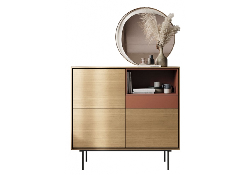 Aura von Angel Martí und Enrique Delamo für Treku entworfen, ist eine hohe Anrichte der Aura Kollektion. Die Komposition hat eine Holzstruktur auf Metallbeinen, ein offenes Fach in lackierter Ausführung, Module in Holzoptik.