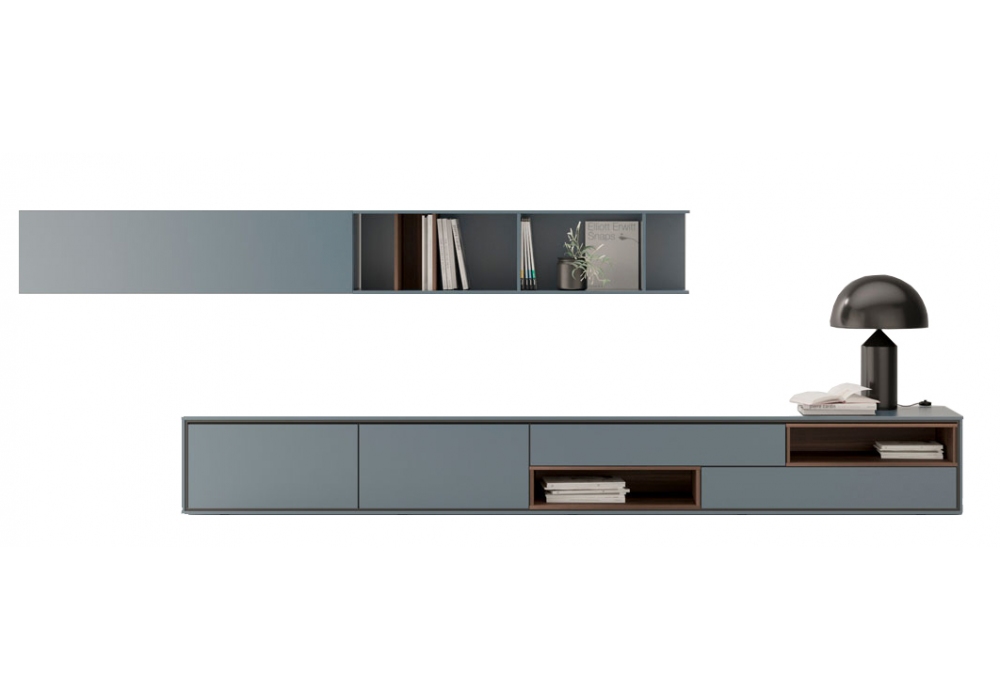 Aura von Angel Martí und Enrique Delamo für Treku entworfen , ist ein Sideboard aus der Aura-Kollektion. Die Komposition hat eine lackierte Struktur mit zwei Türen, zwei Schubladen und zwei Fächern. Die Wandeinheit mit offenem Modul und Klappentürmodul in lackierter Ausführung ist im Lieferumfang enthalten.