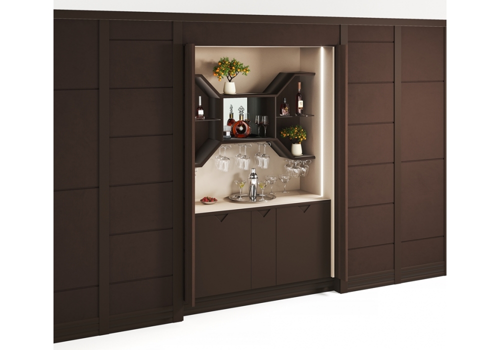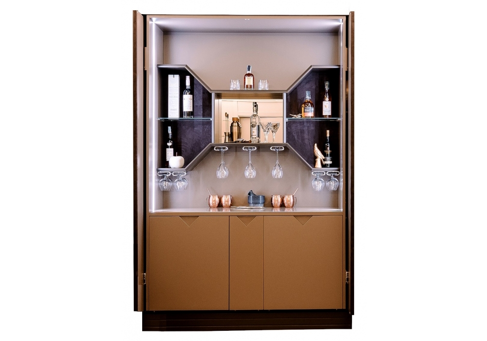 Fellini bar von Vismara Design entworfene, ist ein Stangenschrank mit einziehbarem Schiebesystem. Beim Öffnen gleiten die Türen heraus und in eine Seitentasche zurück. Die beiden Türen sind mit Eco Nabuk abgedeckt, der untere Teil besteht aus: Kühlschrank und Lagerung. Hochglanzlackierte Arbeitsplatte, Oberteil aus lackiertem Glas, lackierte Regale und Innenverkleidung in Eco Nabuk, LED-Beleuchtung. Matt lackierte Struktur.
