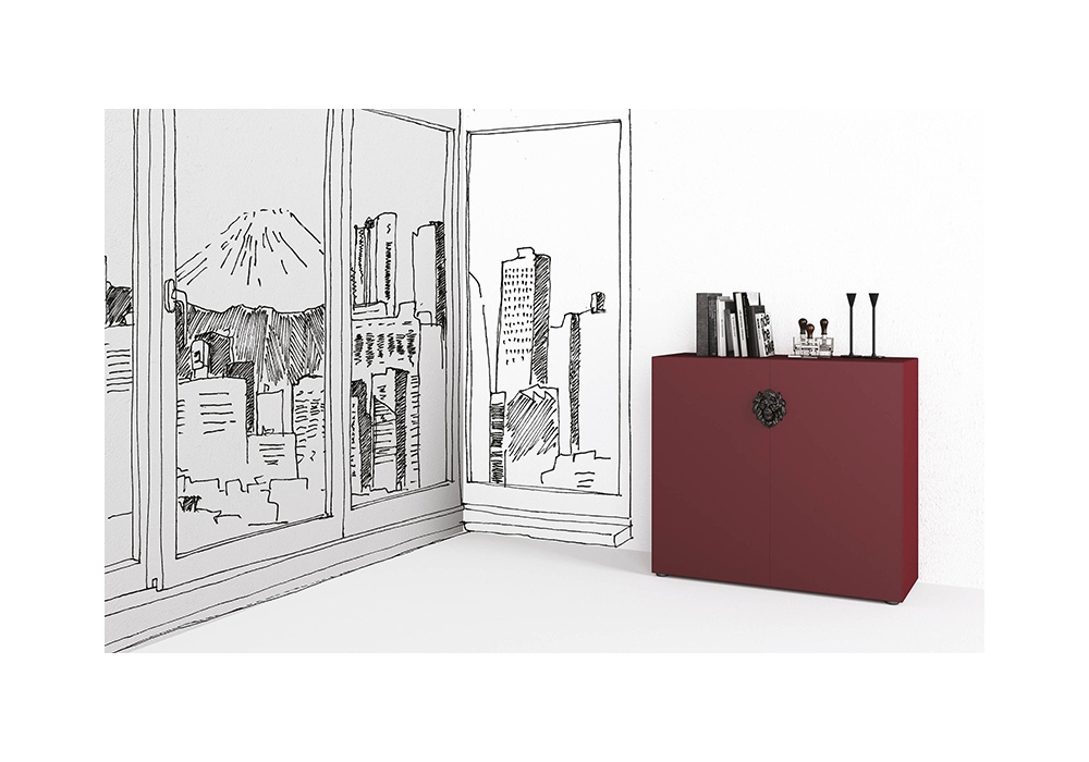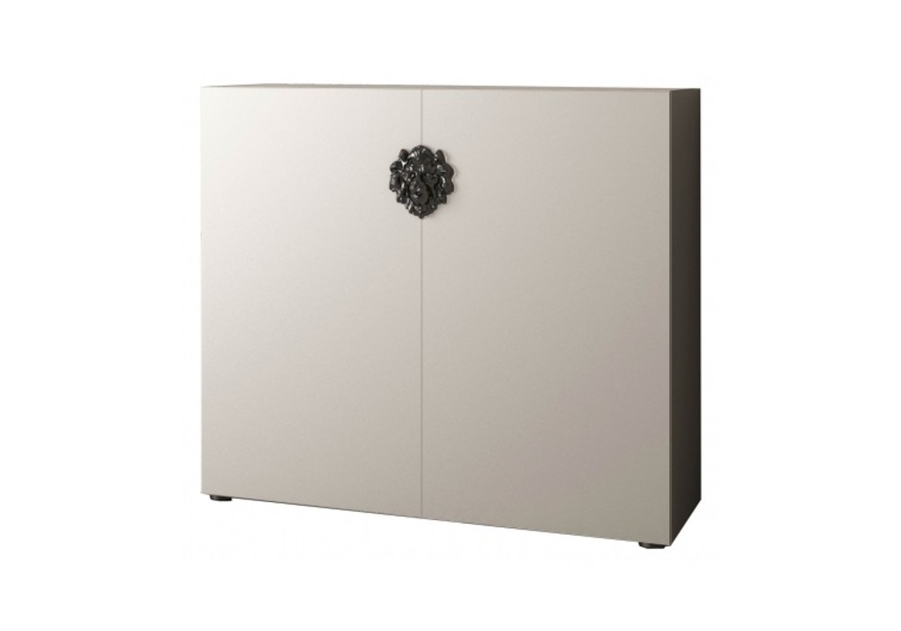 King von DSH für Minotti Italia entworfen, ist ein Sideboard mit Flügeltüren aus Agglomeratholz, verstellbare Füße. Geprägte Oberfläche in verschiedenen Farben erhältlich. Dekoratives Element (Löwenkopf) aus schwarzem Nickelmetall. Zwei Größen erhältlich.