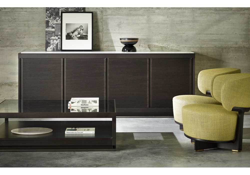 I.C.S. Von Roberto Lazzeroni für Ceccotti Collezioni entworfen, ist ein Sideboard mit 4 Türen, gefertigt aus massivem amerikanischem Nussbaum und furniertem Sperrholz, mit geriffelten Türen und Seitenwänden. Nr. 1 internes Holzregal in jedem Fach, Platte aus Holz, Beschläge aus satiniertem Nickelmessing und Grundrahmen aus satiniertem Edelstahl. Auf Anfrage Marmorplatte, Beschläge und Grundgestell aus brüniertem Messing.