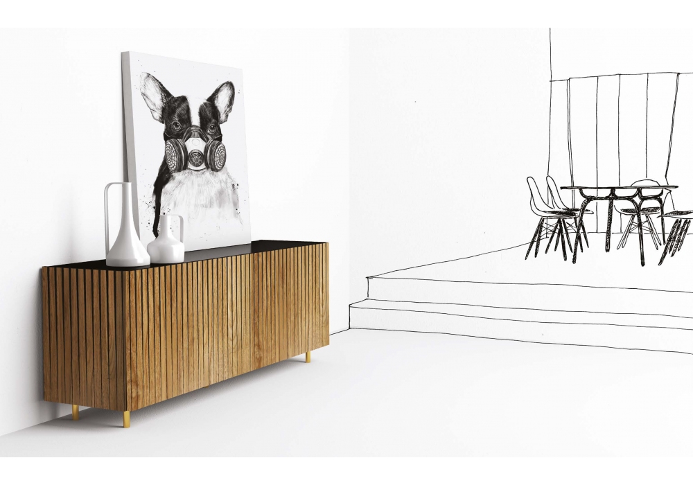 Dorotea Bassa von Claudio Lovadina für Minotti Italia entworfen, ist ein Sideboard mit Flügeltüren und Seiten aus schwarzem Agglomeratholz in dreieckigen Abschnitten mit dreidimensionalem Effekt bearbeitet, Oberflächen aus Teakholz, transparent matt. Stütze in verschiedenen Ausführungen erhältlich: mit schwarzem Fuß (Höhe 3 cm) oder mit Füßen in Messing- oder Nickelfarbe (Höhe 10 cm).
