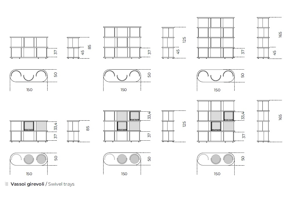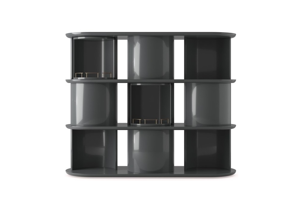 Hide&Seek von Pietro Russo für Gallotti&Radice entworfen, ist ein Behälterschrank mit Struktur, Regalen und Halbzylinder aus lackiertem Holz in den Farben Rot, Grau, Schwarz, Weiß, Grün oder Blau. Halbzylinder mit vorderer oder hinterer Öffnung. Verfügbare Version mit rotierenden Zylindern in vorgegebenen Positionen, die das Schließen ermöglicht der Fächer. Details aus satiniertem Messing.