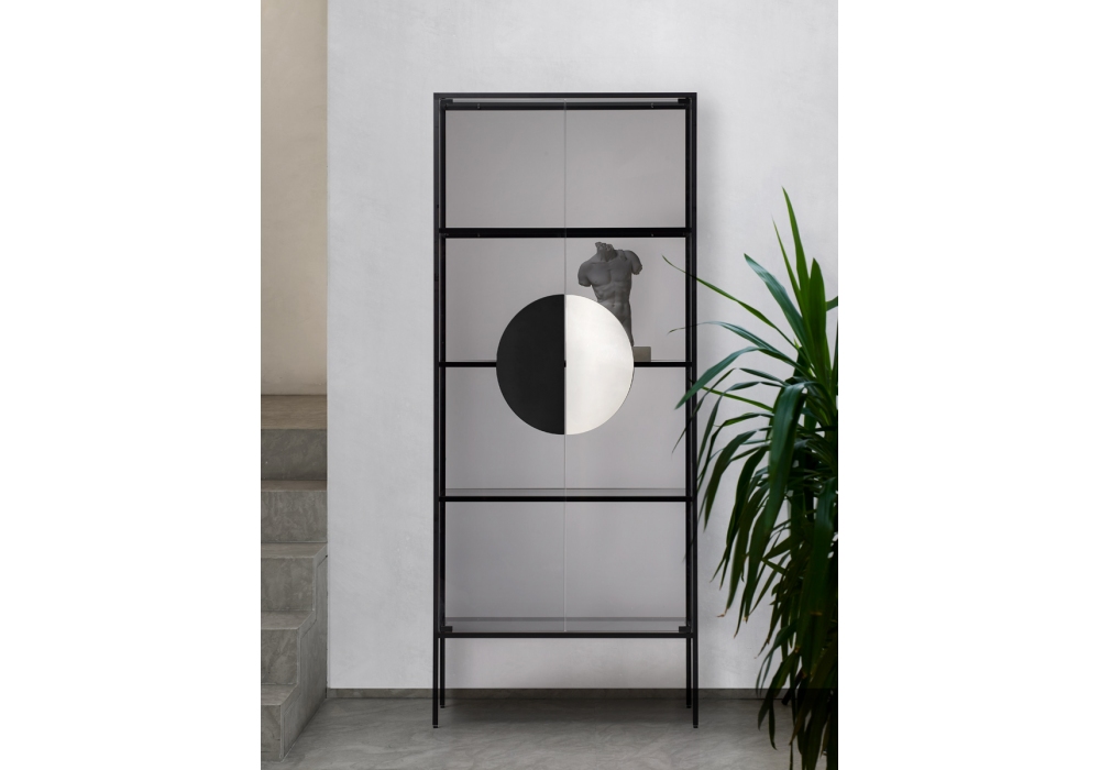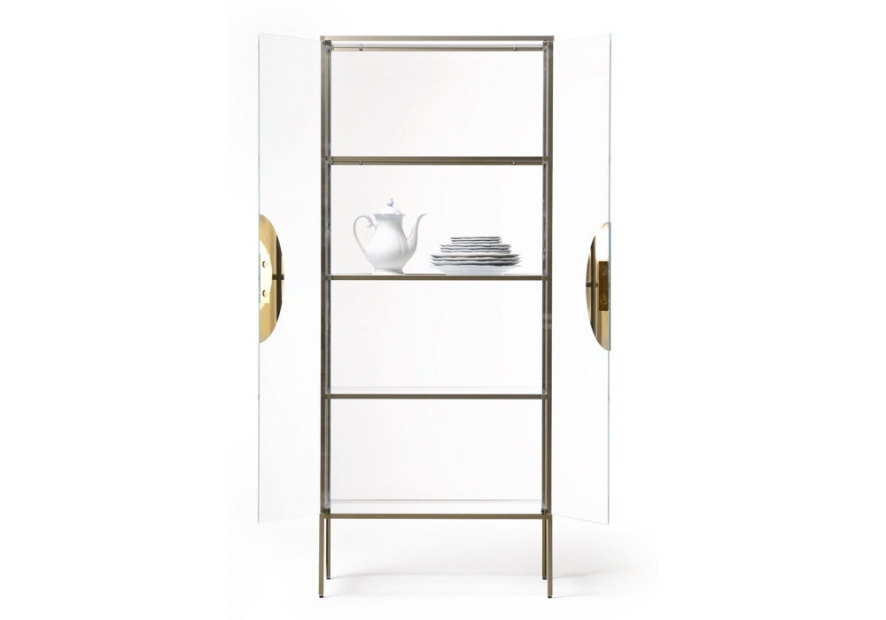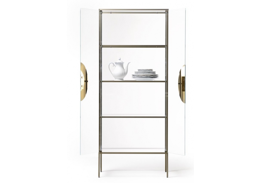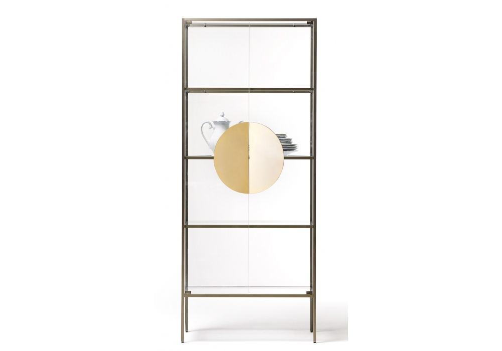 Yang von Marta Giardini für Opinion Ciatti entworfen, ist eine Vitrine aus gehärtetem Glas mit dekorativem Griff. Verfügbar in zwei Ausführungen: Struktur mit mattschwarzem Finish, Griff in schwarzem Nickel-Finish und Rauchglas; Struktur mit brüniertem Messingfinish, Griff in 24 K Goldfinish und transparentem Glas.