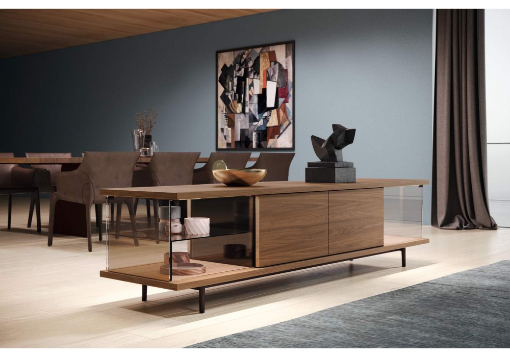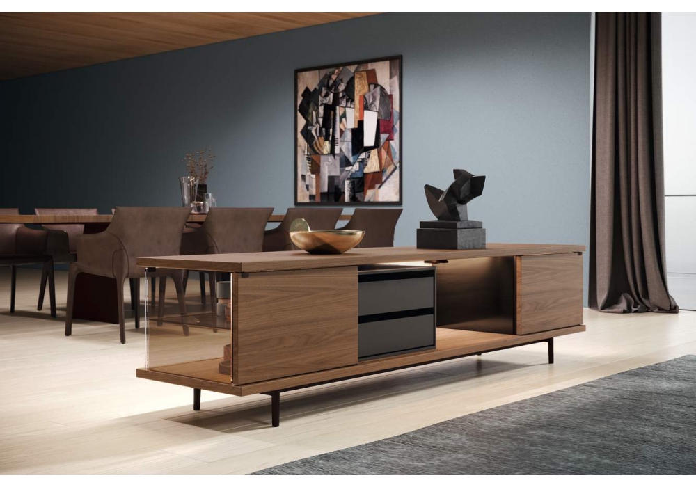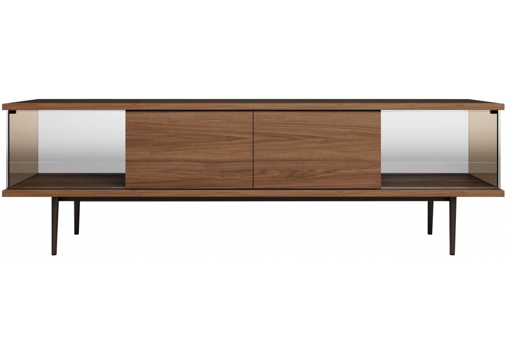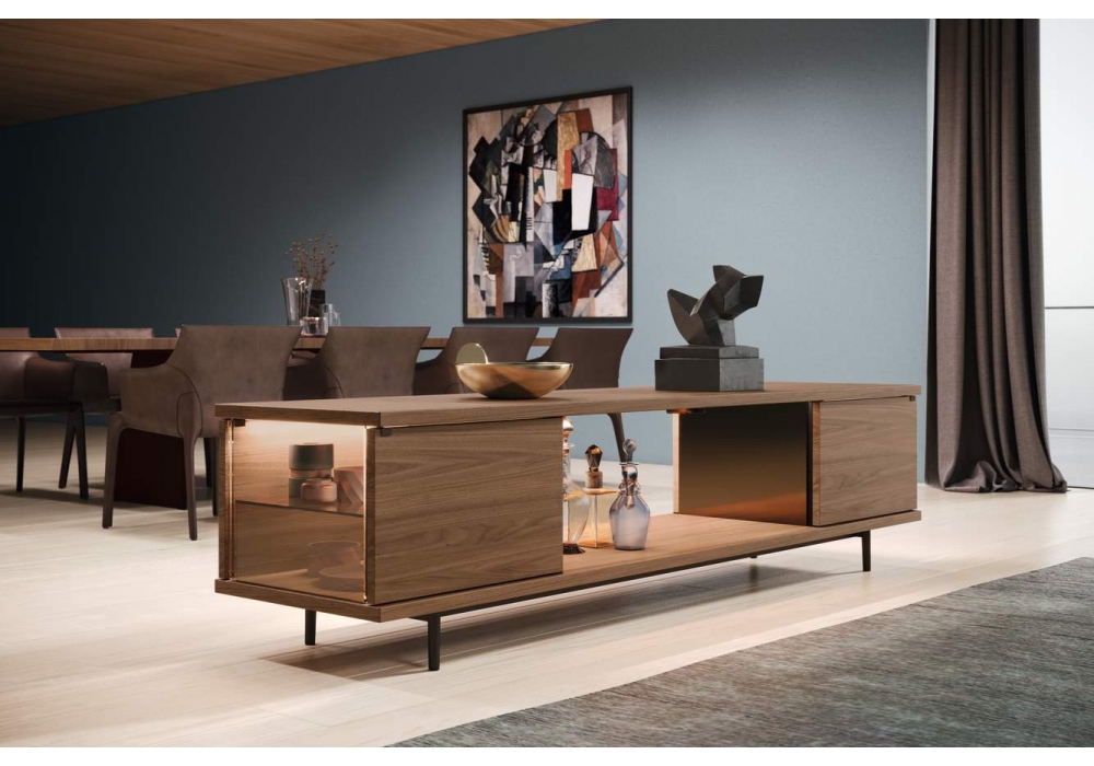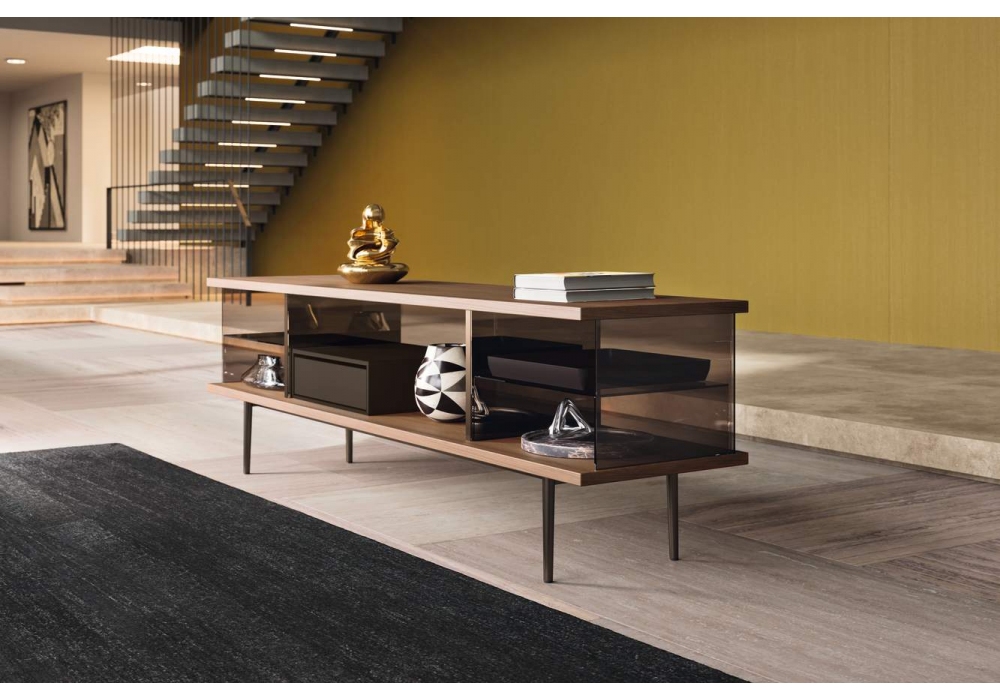 The Farns von Eoos für Walter Knoll entworfen, ist eine Sideboard-Kollektion erhältlich mit zwei, vier oder acht Türen. Einige Türen sind aus Sicherheitsglas transparent mit matt bronzefarben lackierten Stahlgriffen, andere aus furniertem und lackiertem Holz. Alle Türen lassen sich um 180 Grad öffnen. Platte aus Sicherheitsglas Bronze. Gestell aus lackiertem Stahl mit integrierter Höhenverstellung.