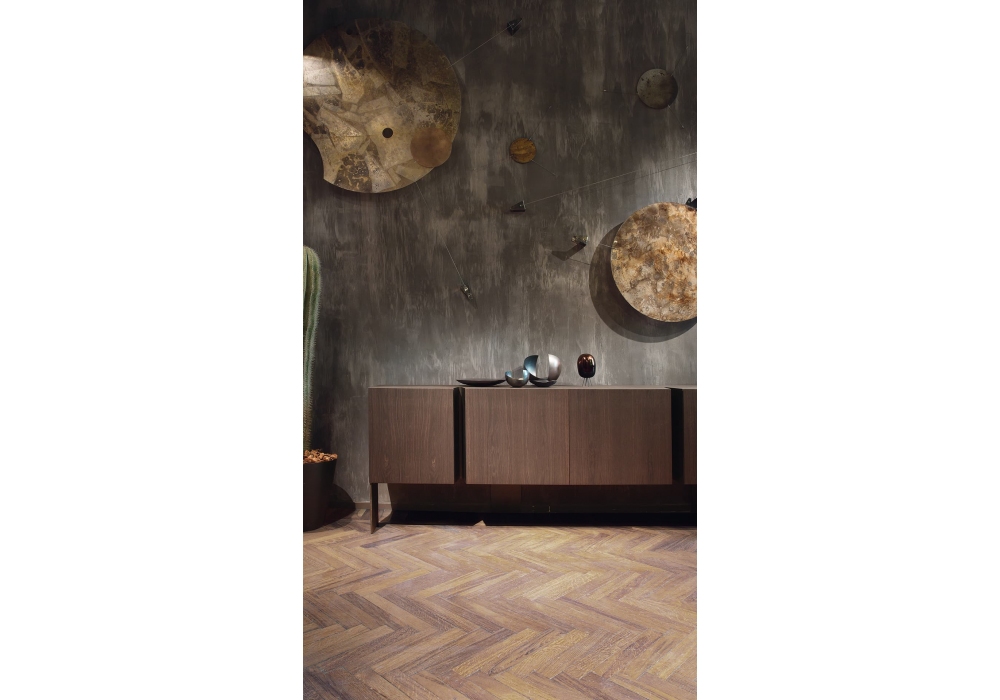 B-Side von Massimo Castagna für Henge entworfen, ist ein Sideboard mit Struktur und Türen aus Massivholz. Untergestell aus brüniertem schwarzem Stahl und V-Cut-Details in Metalloptik.