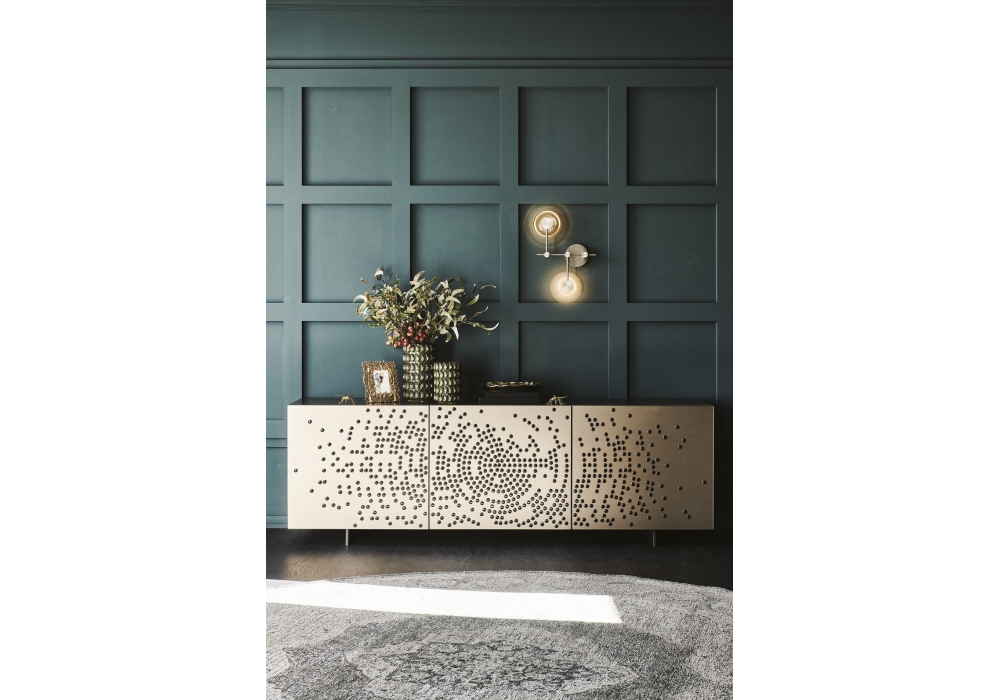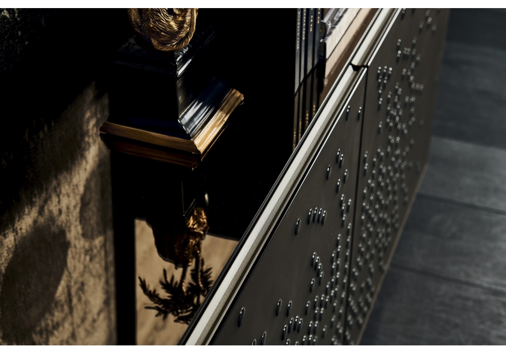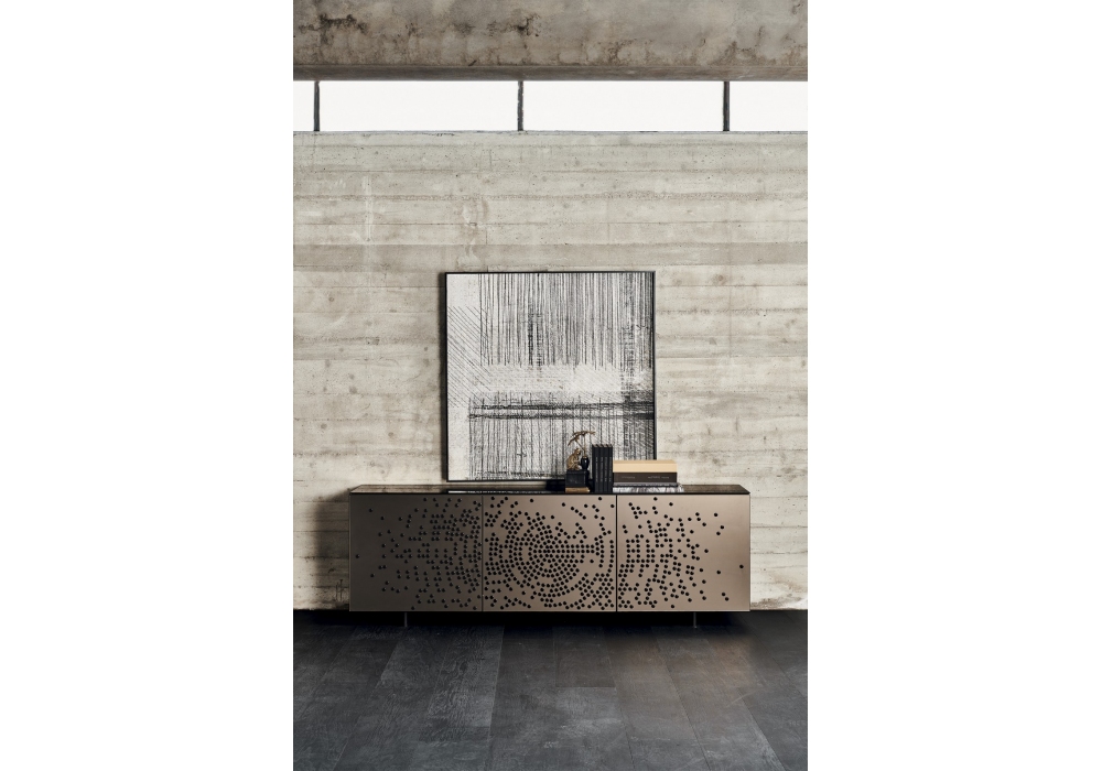 Voyager von Lorenzo Remedi für Cattelan Italia entworfen, ist ein Sideboard mit Struktur aus lackiertem Holz, Platte aus extra klarem verspiegeltem Bronzeglas oder in der gleichen Ausführung wie die Struktur. Türen aus bronze verspiegeltem Milchglas mit Reliefverzierungen in glänzendem Schwarz oder aus bronzeverspiegeltem Glas mit Reliefverzierungen in Goldfarbe. Profile aus geprägtem Titan-Aluminium. Innenregale aus Klarglas. Erhältlich in vier Größen.
