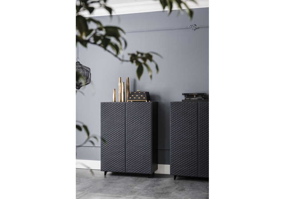 Tiffany von Paolo Cattelan für Cattelan Italia entworfen, ist ein Sideboard aus Holzstruktur in verschiedenen Ausführungen und Türen mit gestepptem Bezug aus Leder oder Kunstleder. Füße aus geprägtem lackiertem Stahl. Regale aus Rauchglas und Teilweiser verspiegelter Innenraum.