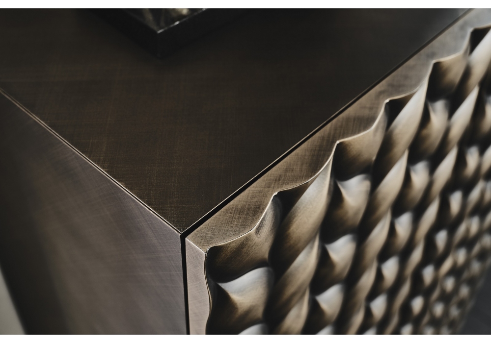 Spiga von Paolo Cattelan für Cattelan Italia entworfen, ist ein Sideboard aus Holzstruktur in verschiedenen Ausführungen. Füße aus geprägtem lackiertem Stahl. Regale aus Rauchglas und Teilweiser verspiegelter Innenraum.