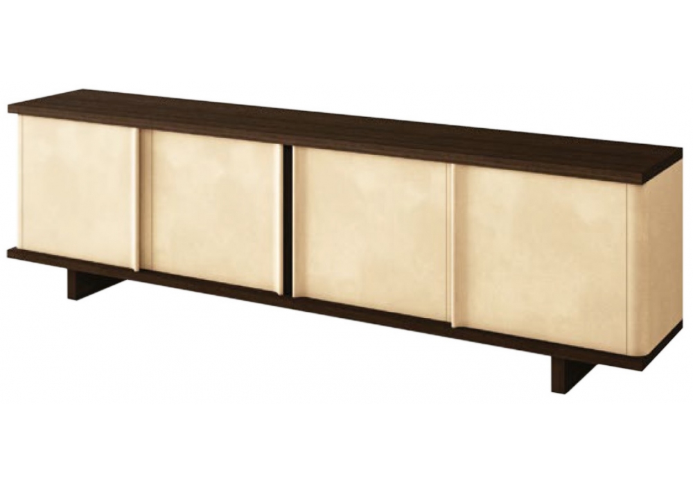 Joni von Christophe Delcourt für Baxter entworfen, ist ein Sideboard mit einer Struktur aus gebürstetem, furniertem Sperrholz in Eichenholz, gebeizt in Caramel-, Charcoal- oder Tobacco. Türen und Pfosten mit Sperrholzleder bezogen. Verstellbare Füße. Verfügbar in verschiedenen Größen.