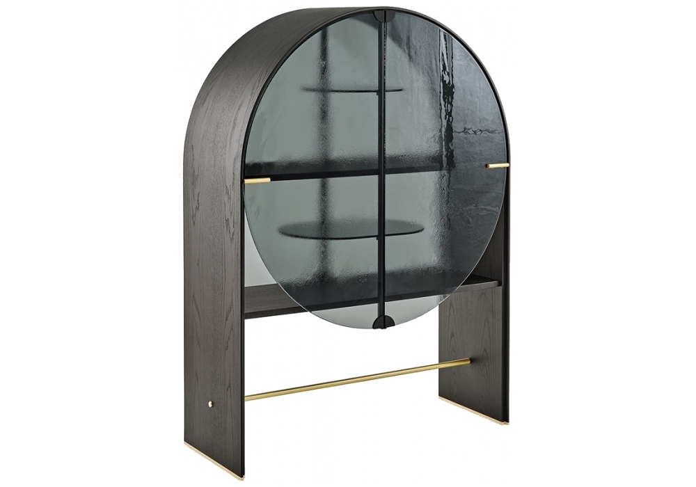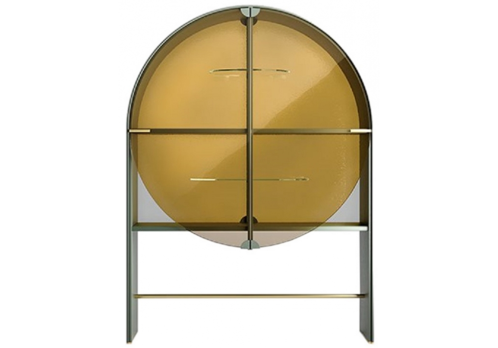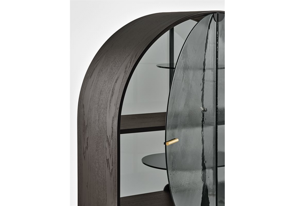 und Tür aus vorgespanntem geschmolzenem Rauchglas “grigio Italia” 6mm. Beide Versionen mit Rückwand und Böden aus vorgespanntem Rauchglas “grigio Italia” 6mm. Details aus Messing satiniert.