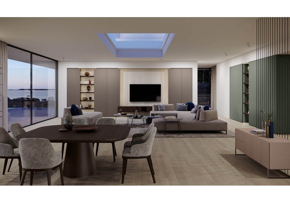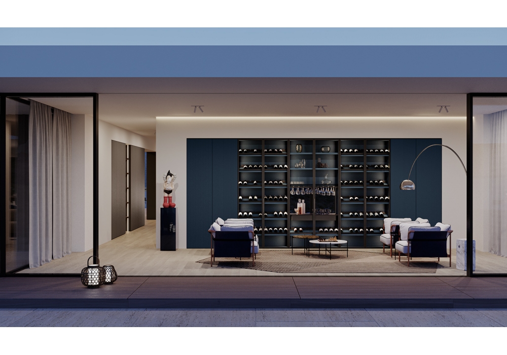 Die von Olivieri entworfene und produzierte Villa des Modeunternehmers ist ein integriertes raumhohes Tagessystem mit industrialisierten festen Elementen und maßgefertigten Elementen, die typisch für die Tischlerei sind. Alles mit dem Ziel, Zeit, Qualität und Kosten zu optimieren.