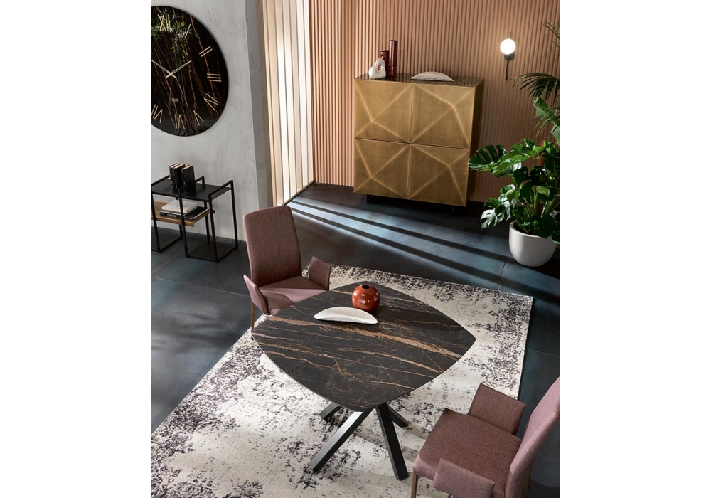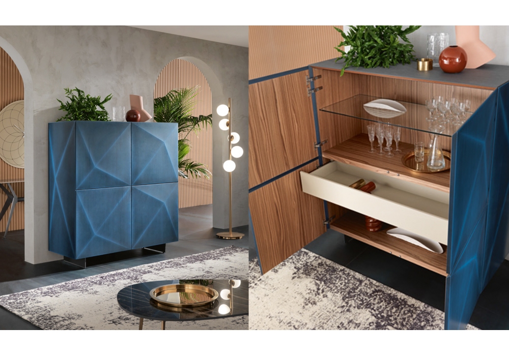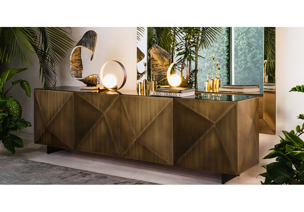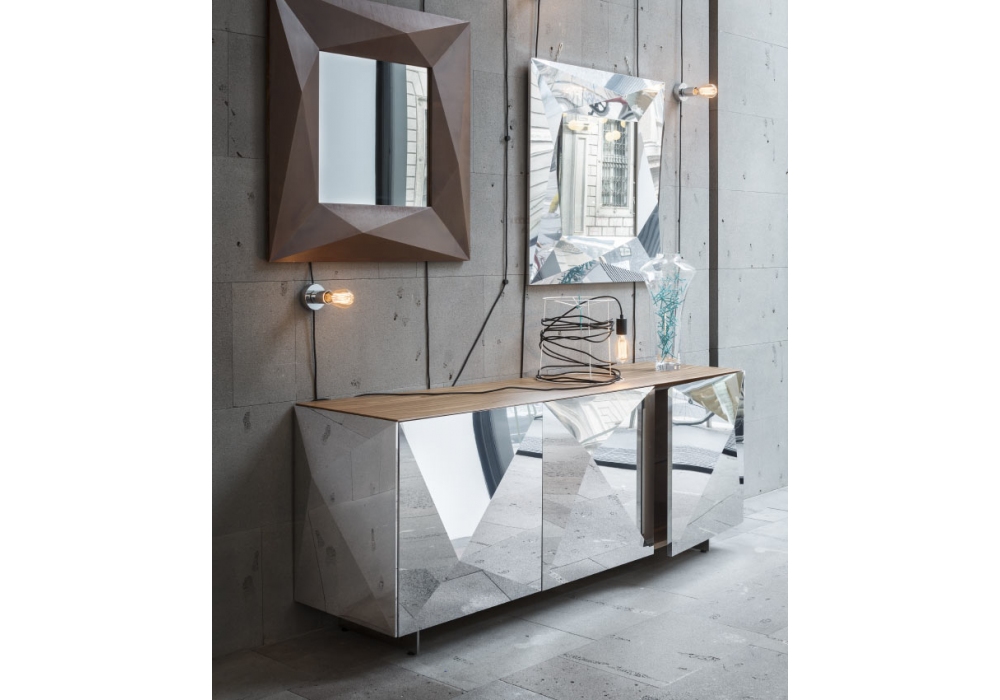 Cubric von Riflessi entworfen, ist ein Sideboard mit Türen und Seiten aus diamantgebogenem Metall. Innen und Rückseite in Nussbaum Canaletto. Interne Regale aus transparentem Glas. Push-Pull-Öffnung. Auf Wunsch können Innenschubladen und Holzeinlegeböden eingesetzt werden. Verfügbar in mehreren Abmessungen und Ausführungen.