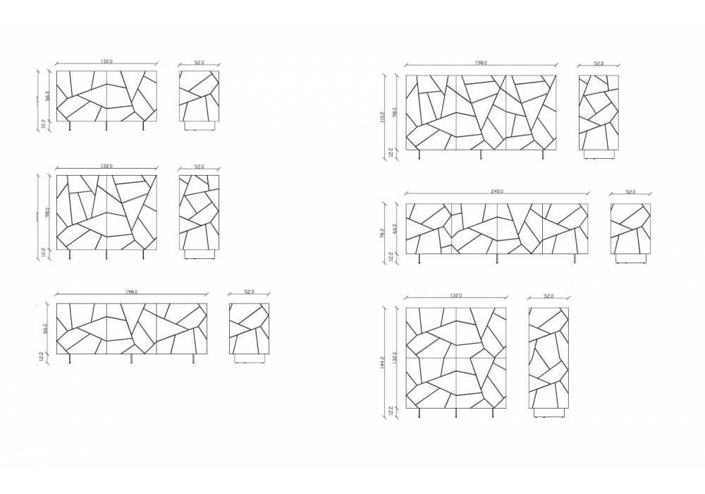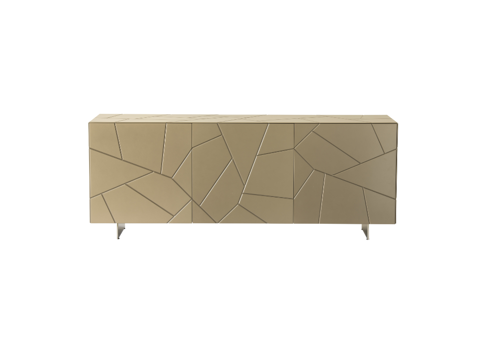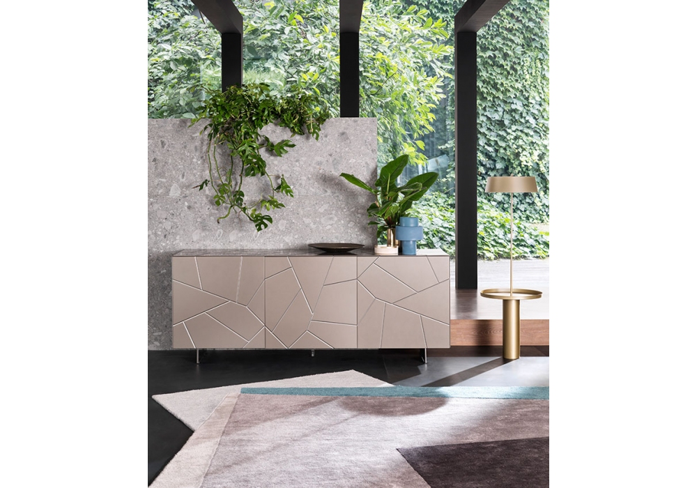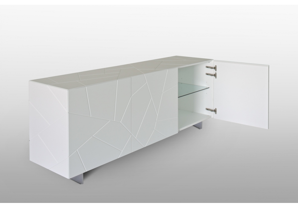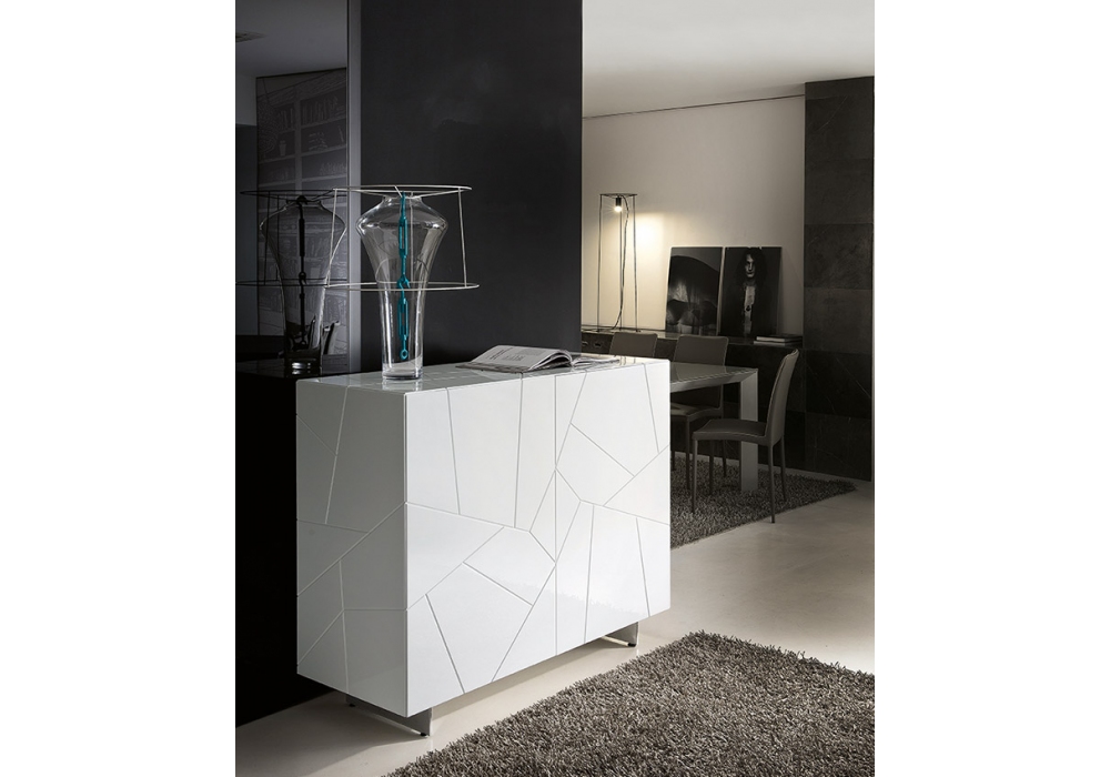 Segno von Riflessi entworfen, ist ein Sideboard mit Holzstruktur mit Gravuren in mattem oder glänzendem Weißlack oder in RAL-Farben. 45° geschnittene Türen, Decken und Hüften. Interne Regale aus transparentem Glas. Push-Pull-Öffnung. Tischplatte aus Holz, Keramik oder Glas. Verfügbar in mehreren Ausführungen und Abmessungen.