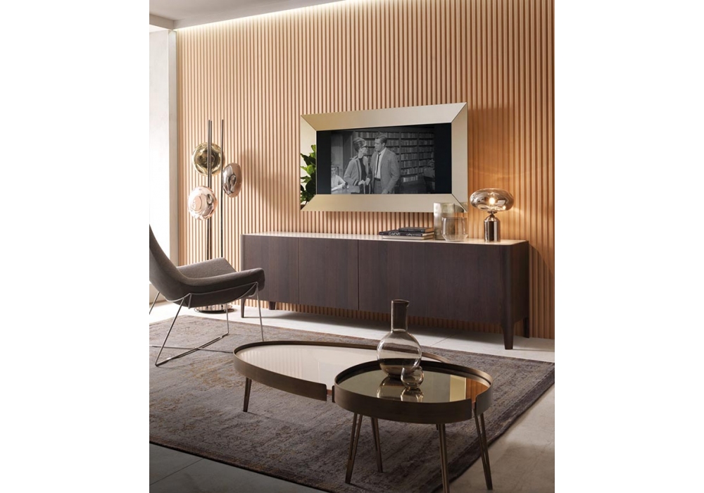 Cross von Riflessi entworfen, ist ein Sideboard mit Holzstruktur mit Scharniertüröffnung und Glas- oder Keramikplatte. Verfügbar in mehreren Abmessungen und Ausführungen.