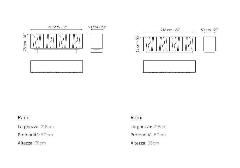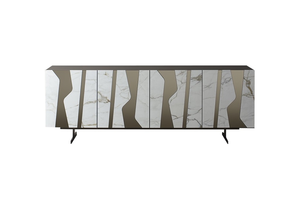 Rami, von Maurzio und Silvia Varsi für Bonaldo entworfen, ist ein Sideboard mit Außenstruktur aus matt bronzefarben lackiertem Holz, Türen aus Keramik Calacatta macchia vecchia und Spiegel mit Bronzeeffekt und Sockel aus bronzefarben lackiertem Metall. Das Untergestell ist mit Füßen oder mit Sockel erhältlich. Die Innenregale sind aus Melaminholz (auf Anfrage auch aus transparentem Glas erhältlich).