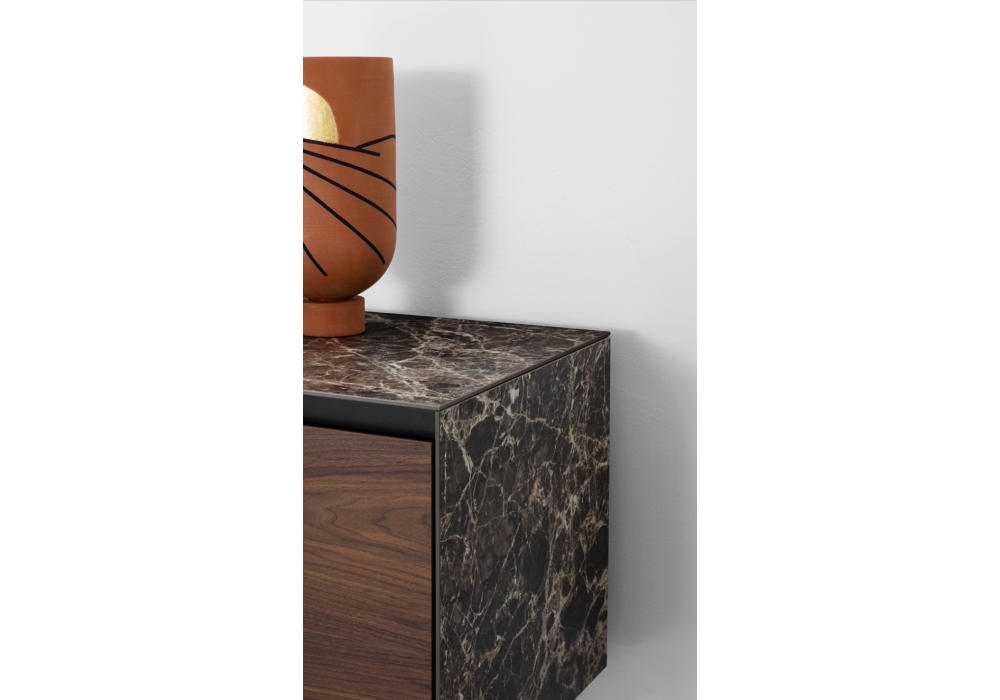 Vitrum von Andrea Lucatello für Miniforms entworfen, ist ein Sideboard mit schwarz lackierter Basis und Nut, Platte und Seiten aus weißem satiniertem oder extraklarem Keramikglas, Front aus Holz oder Keramikessenz. Erhältlich in verschiedenen Ausführungen.