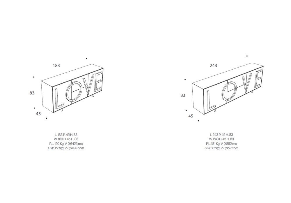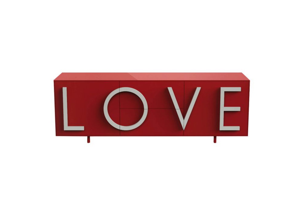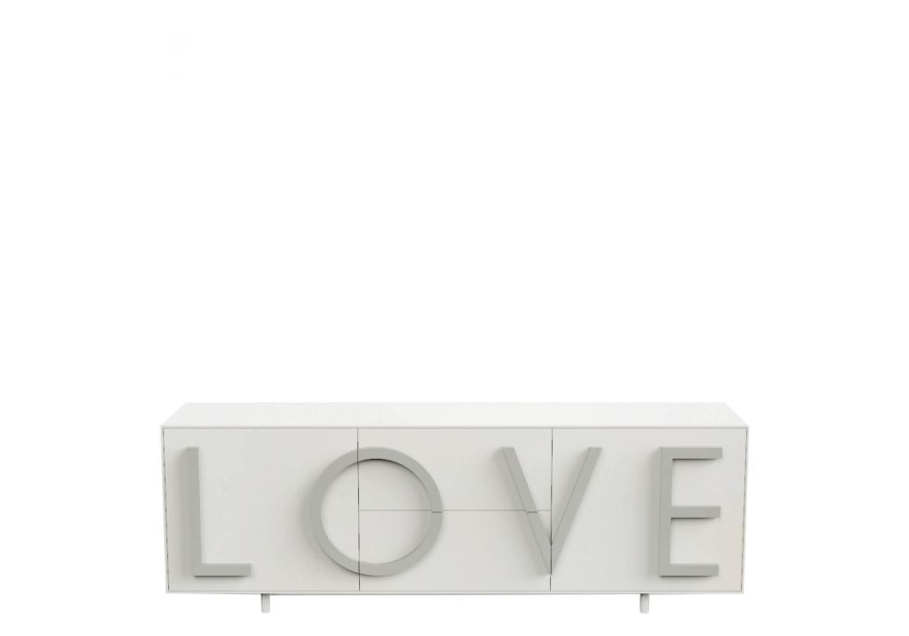 Love, von Fabio Novembre für Driade entworfen, ist ein Sideboard mit zwei seitlichen Flügeltüren und beweglichem Innenregal, mit zwei zentralen Schubladen mit Vollauszug. Struktur aus außen und innen lackiertem MDF. Reliefschriftzug LOVE mit Grifffunktion aus leicht auswechselbarem lackiertem MDF und personalisiert so den Behälter. Verstellbare zylindrische Füße Durchmesser 3,5 cm. und Höhe 10 cm. in der gleichen Farbe wie die Struktur. Erhältlich in mittlerer oder großer Ausführung. Nur für den internen Gebrauch.