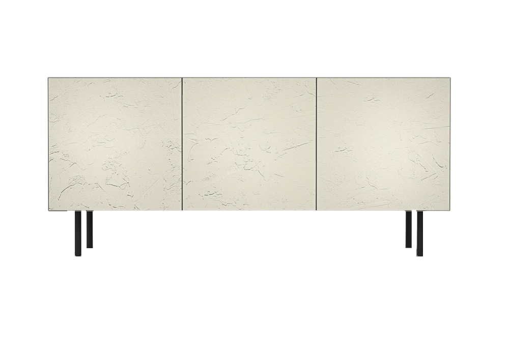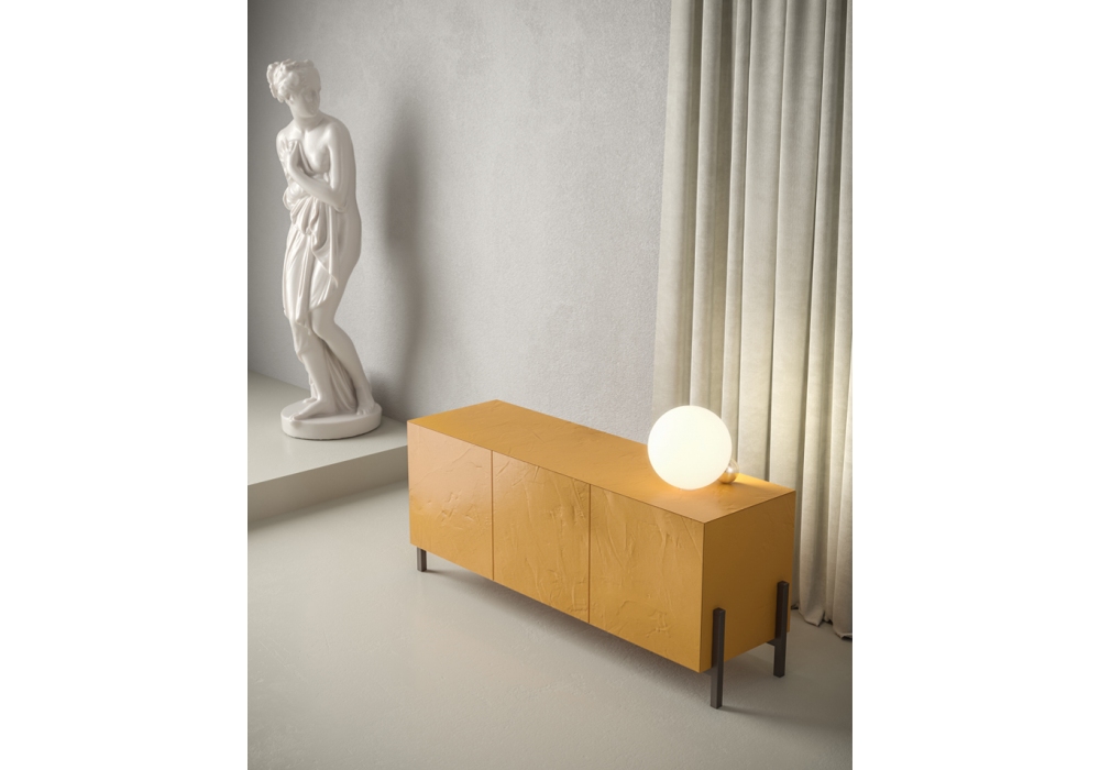 Sharp von Studio Debonademeo für Momenti entworfen, ist ein Sideboard mit 3 oder 4 Türen aus MDF-Struktur mit matt lackierter Innenseite. Struktur mit 45° geneigter Kante. Außenausführung und Türen: Mattlack, Mattlackmörtel und Formmörtel, bezogen mit bedrucktem Glasfasergewebe, Direktdruck-Glanzlack mit Extra-Glanz-Finish. Schützendes Finish: ungiftig matt und extra glänzend glänzend. Füße oder Sockel mit Metallstruktur in den Farben: Weiß, Schwarz, Bronze und Messing. Inklusive Nivellierfüße.
