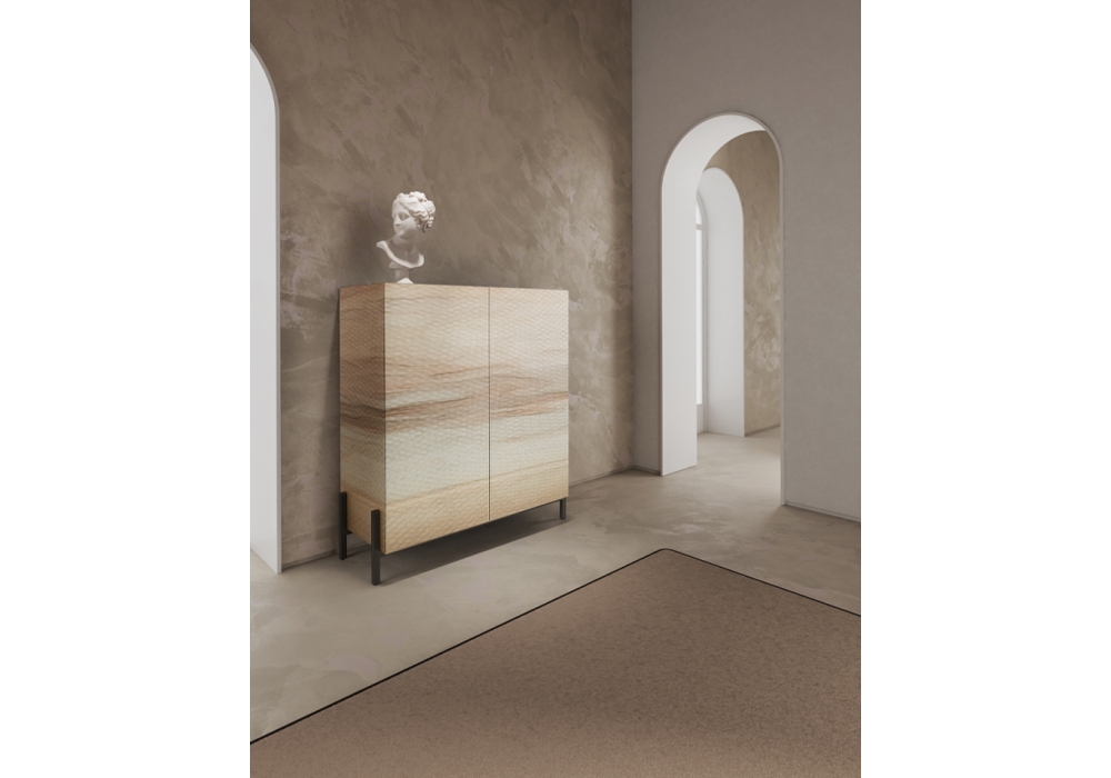 Sharp von Studio Debonademeo für Momenti entworfen, ist ein Sideboard mit Struktur aus MDF, mit matt lackierter Innenseite. Struktur mit 45° geneigter Kante. Außenausführung und Türen: Mattlack, Mattlackmörtel und Formmörtel, bezogen mit bedrucktem Glasfasergewebe, Direktdruck-Glanzlack mit Extra-Glanz-Finish. Schützendes Finish: ungiftig matt und extra glänzend glänzend. Füße oder Sockel mit Metallstruktur in den Farben: Weiß, Schwarz, Bronze und Messing. Einschließlich Hardware für Push-Pull-Öffnung.