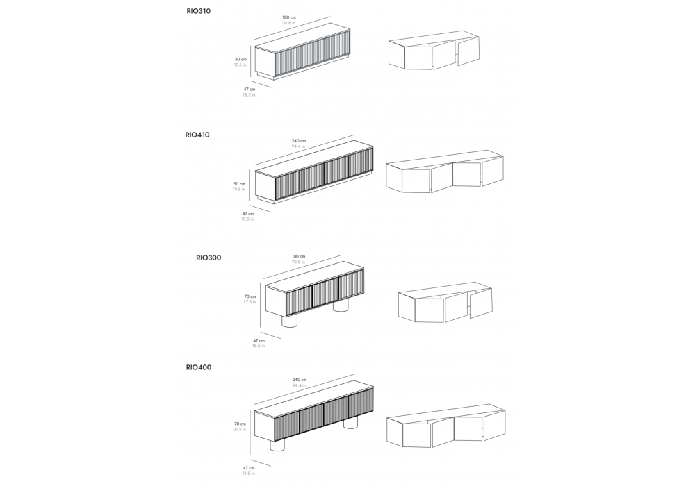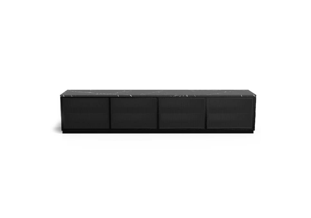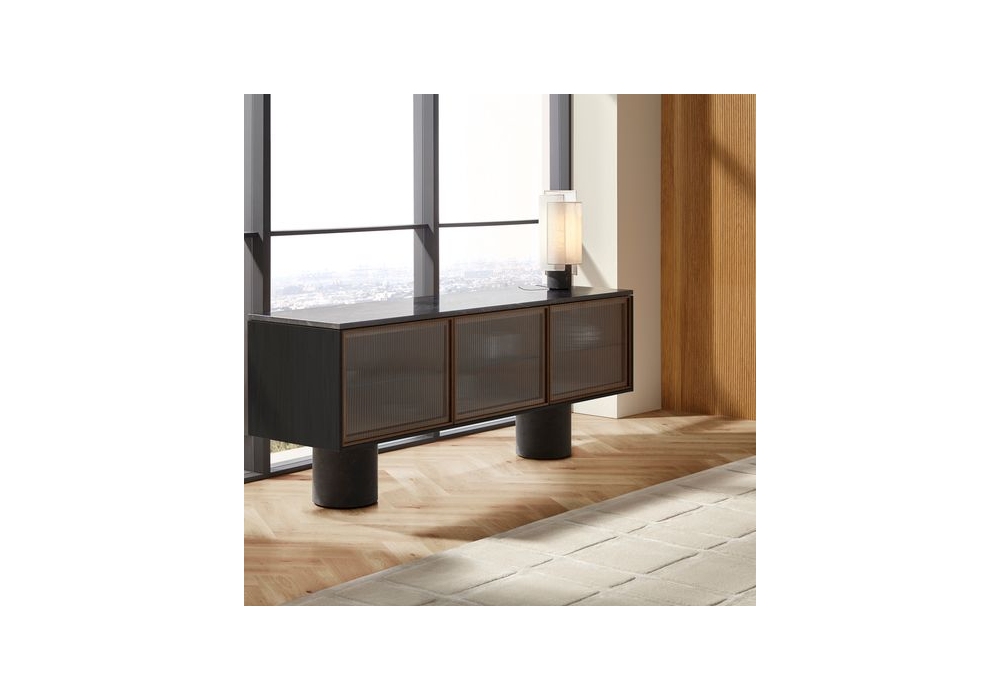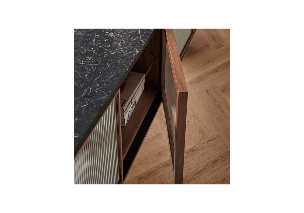 Rio von Sebastian Herkner für Punt entworfen, ist ein Sideboard mit einer MDF-Struktur mit Eichen- oder Walnussfurnier, Platte und Füße/Basis aus Holz oder Marquina-Marmor. Flügeltüren ohne Griffe aus massiver Eiche oder Walnuss und gewelltem Hartglas. Jedes Modul enthält ein Innenregal aus Hartglas mit Befestigung in der Mitte.