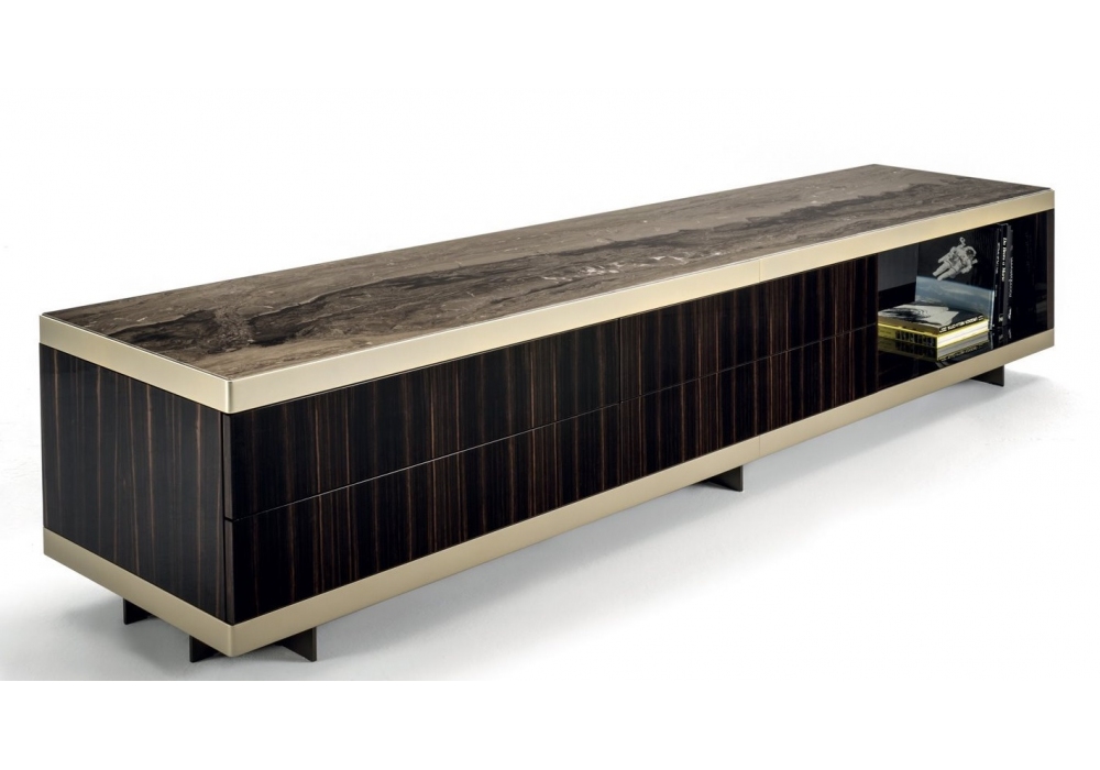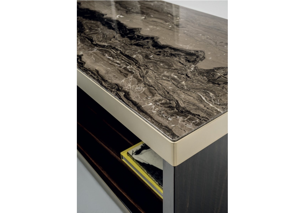 Aspen Evo von iuseppe Viganò für Longhi entworfen, ist ein niedriger Schrank mit Holzstruktur im Wesentlichen oder mit Leder bezogen. Metallteile in glänzender oder matter Ausführung und Platte aus Holz, Marmor, Spiegel oder Kristall. Verfügbar in der Version mit offenem Fach oder mit Klapptür.