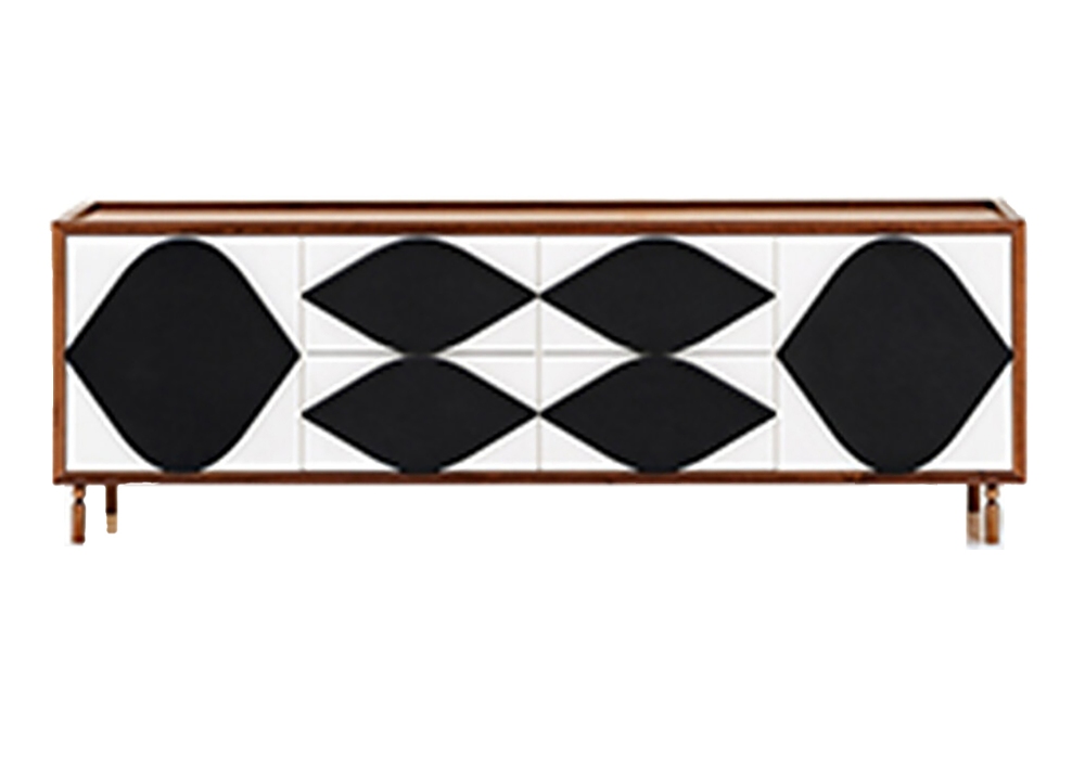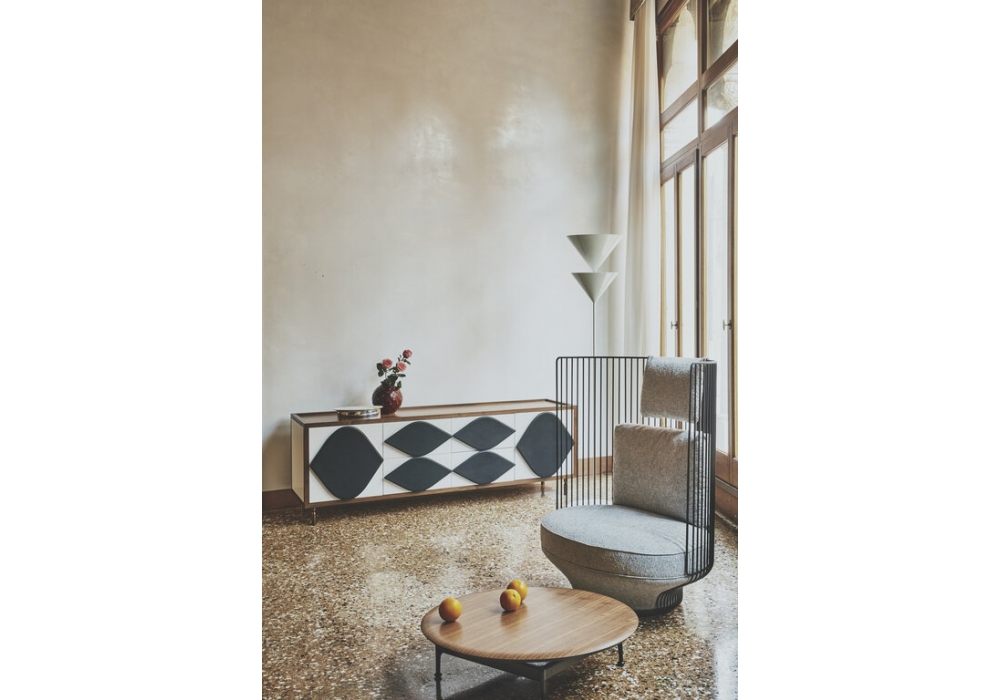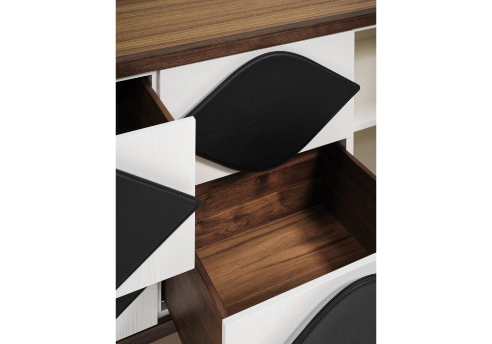 Antigua, von Wittmann und Nichetto für Wittmann entworfen, ist ein Sideboard mit Korpusrahmen aus massivem Nussbaumholz mit allseitig abgeschrägten Kanten, Front und Korpus aus weißem Eschenfurnier, keilgezinkten Schubladen aus massivem Nussbaumholz und Anschlägen und Softeinzug.