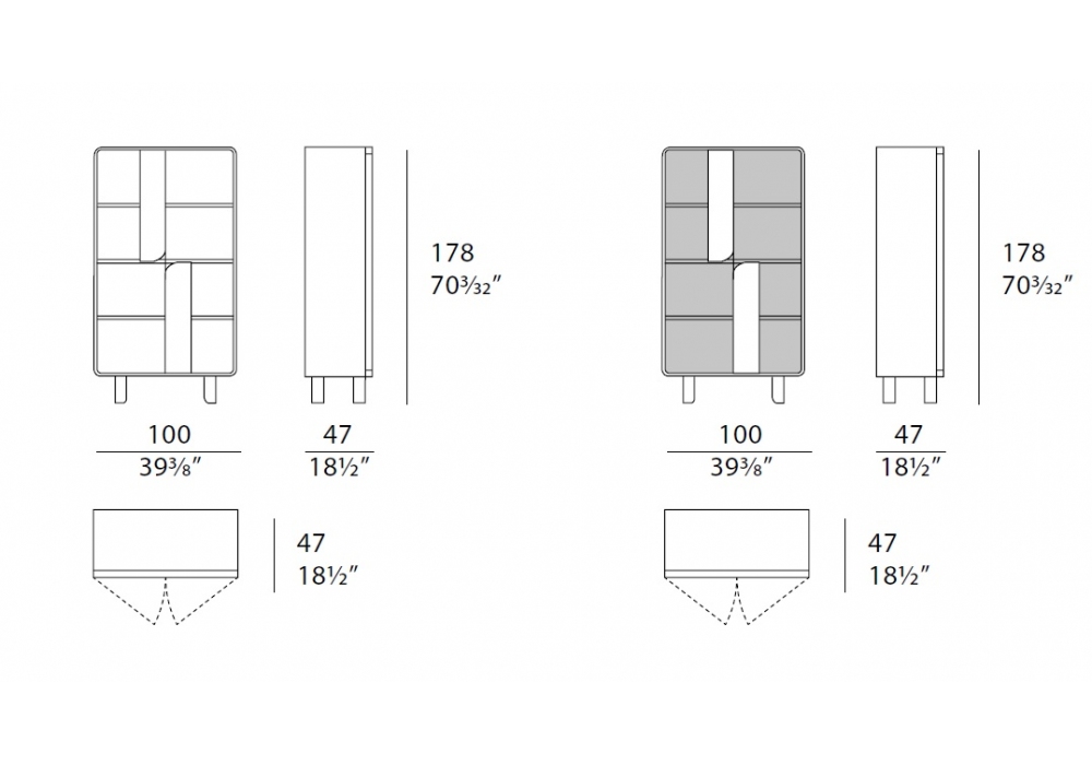 Soul von Giuseppe Viganò für Turri entworfen, ist eine Vitrine mit Struktur aus MDF und Spanplatten mit glänzend lackierter Oberfläche. Es gibt zwei Glastüren mit Griffen aus glänzend lackiertem Holz oder Marmor. Der innere Teil der Rückenlehne kann mit Leder oder mit glänzend lackiertem Holz bezogen werden. Metallteile und Füße in mattem Finish.