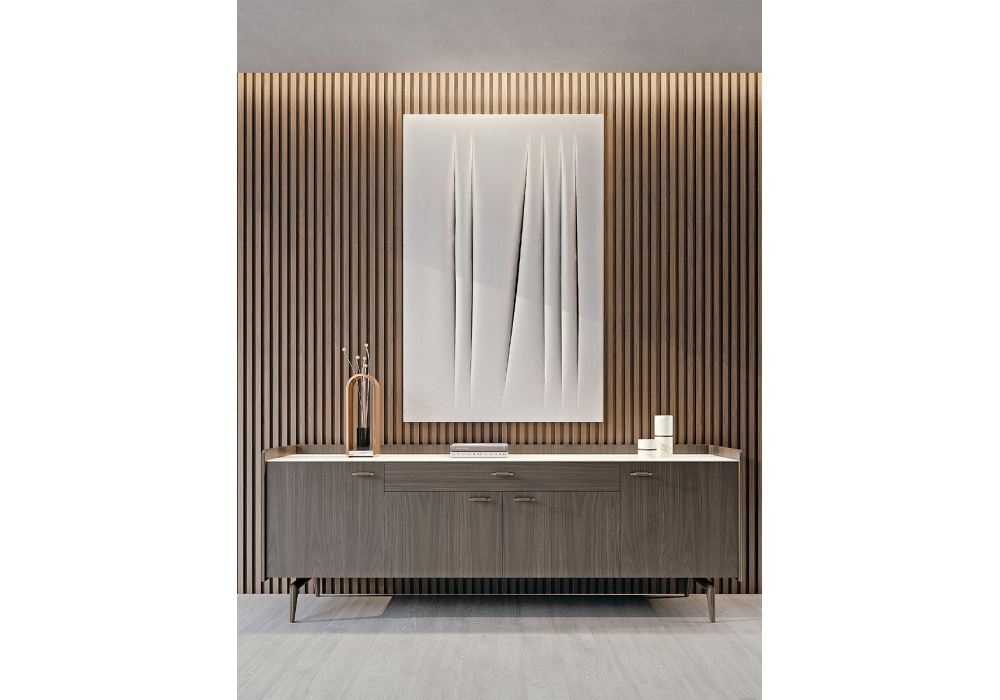 Blues von Giuseppe Viganò für Turri entworfen, ist ein Sideboard mit Struktur aus furniertem Nussbaum und Beinen aus massivem Nussbaum. Die Fronten können in Nussbaum furniertem Holz, mit Leder bezogen oder glänzend lackiert sein. Platte aus Marmor, Leder oder Nussbaumfurnier.